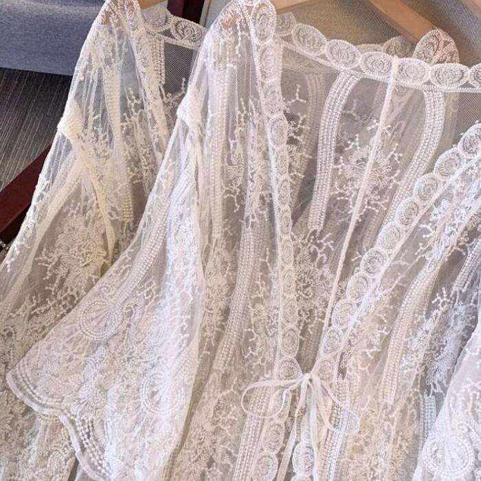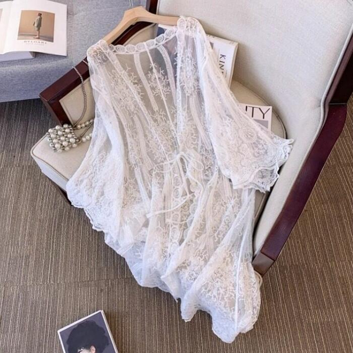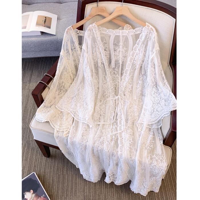 全2色 大きいサイズ 体型カバー エレガント フェミニン おしゃれ シンプル 日焼け防止 冷房対策 トップス カーディガン レディース きれいめ カジュアル 大人可愛い 春 夏 秋 レース 羽織り ボレロ 七分袖 透け感 シアー リボン ベージュ ホワイト 白 20代 30代 40代 50代 M L XL 2XL