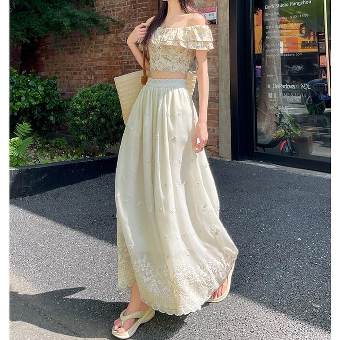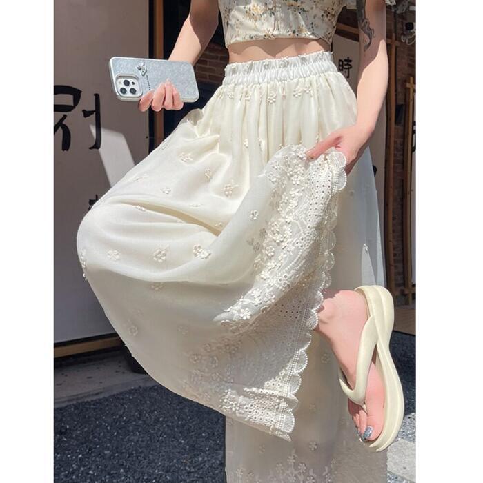 大きいサイズ 体型カバー エレガント フェミニン おしゃれ 楽ちん シンプル ナチュラル ボトムス パンツ レディース きれいめ カジュアル 大人可愛い 春 夏 秋 レース ワイドパンツ 刺繍 ロング丈 ウエストゴム ハイウエスト ロングパンツ ベージュ 20代 30代 40代 50代 S M L XL 2XL