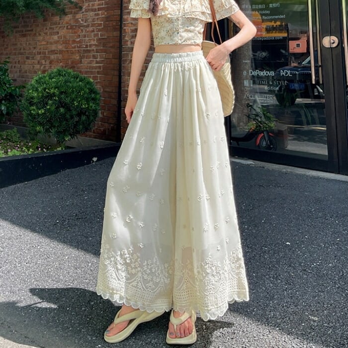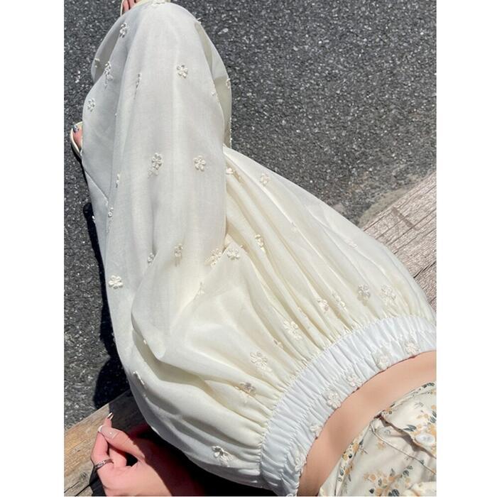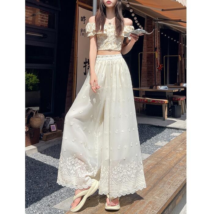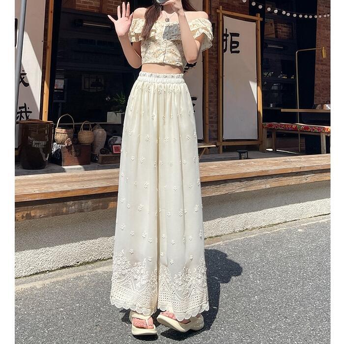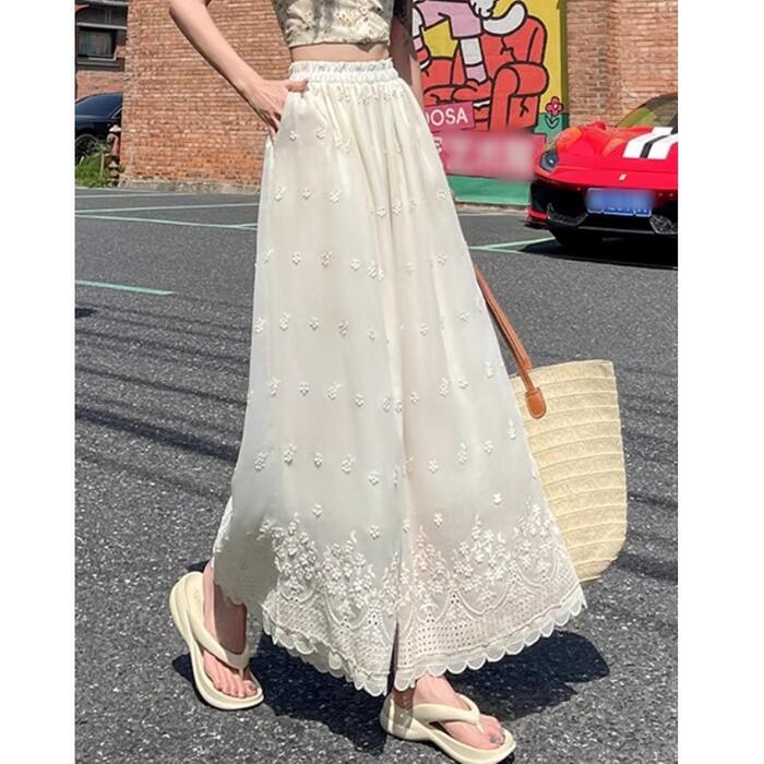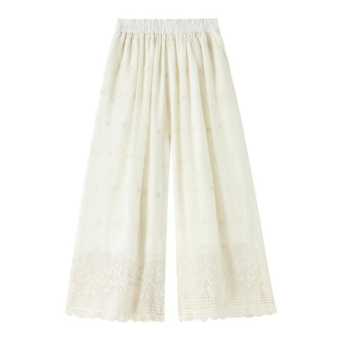 豪華なカットワーク刺繍が目を惹く、エレガントなワイドパンツ。