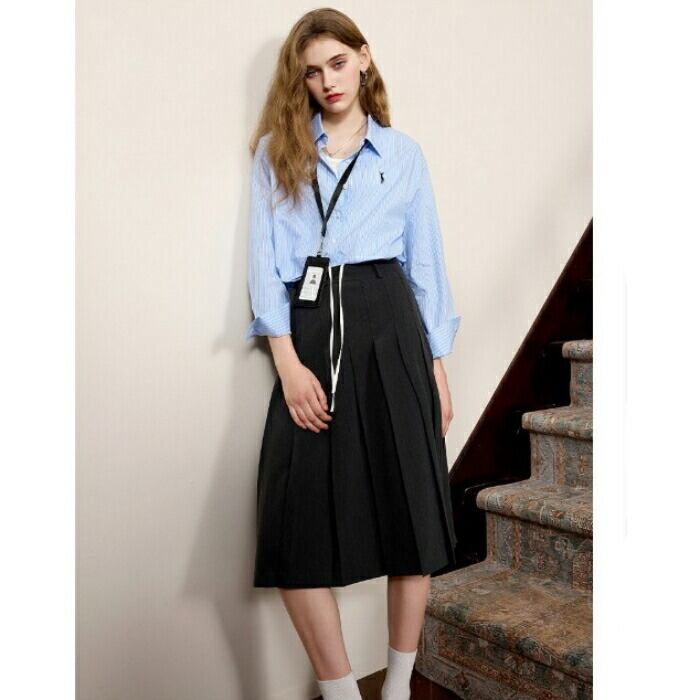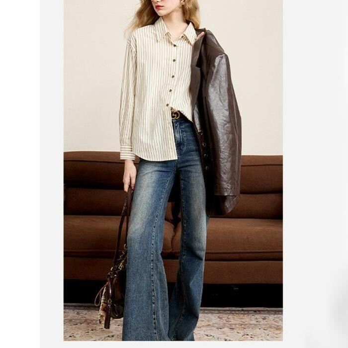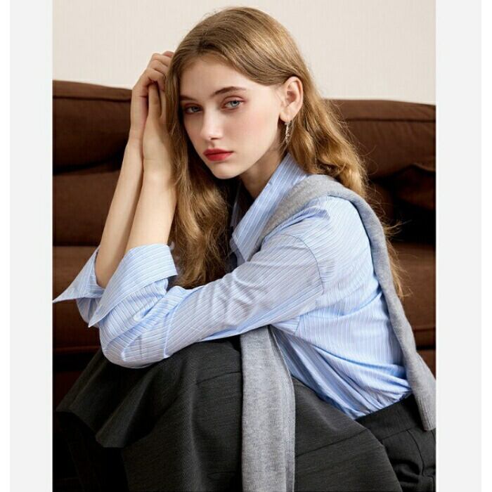 全2色 大きいサイズ 体型カバー エレガント フェミニン おしゃれ シンプル トラッド 通勤 オフィス トップス シャツ ブラウス レディース きれいめ カジュアル 大人可愛い 春 秋 冬 ストライプ 羽織り 長袖 ブルー 青 ベージュ 20代 30代 40代 50代 S M L XL