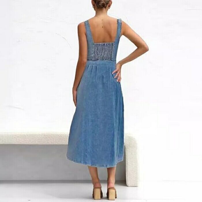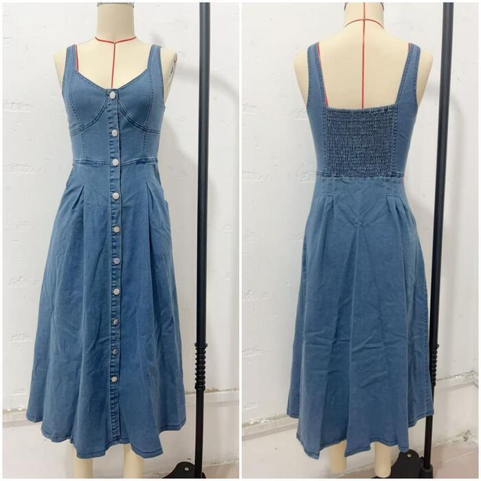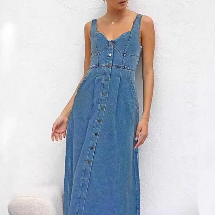 全2色 大きいサイズ 体型カバー エレガント フェミニン おしゃれ シンプル ワンピース ドレス レディース きれいめ カジュアル 大人可愛い 春 秋 夏 キャミワンピ サロペットスカート ノースリーブ Aライン デニム フレア ハイウエスト ロング丈 ブルー 青 20代 30代 40代 50代 S M L XL 2XL