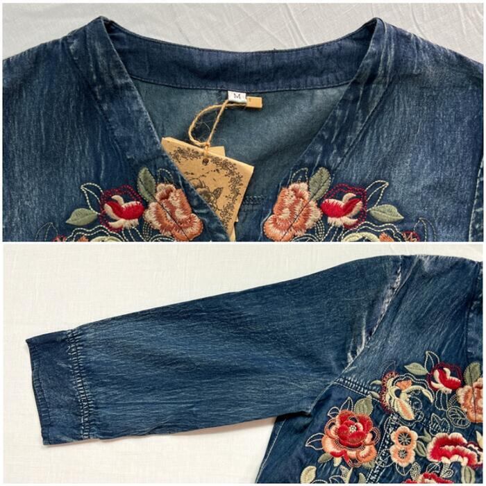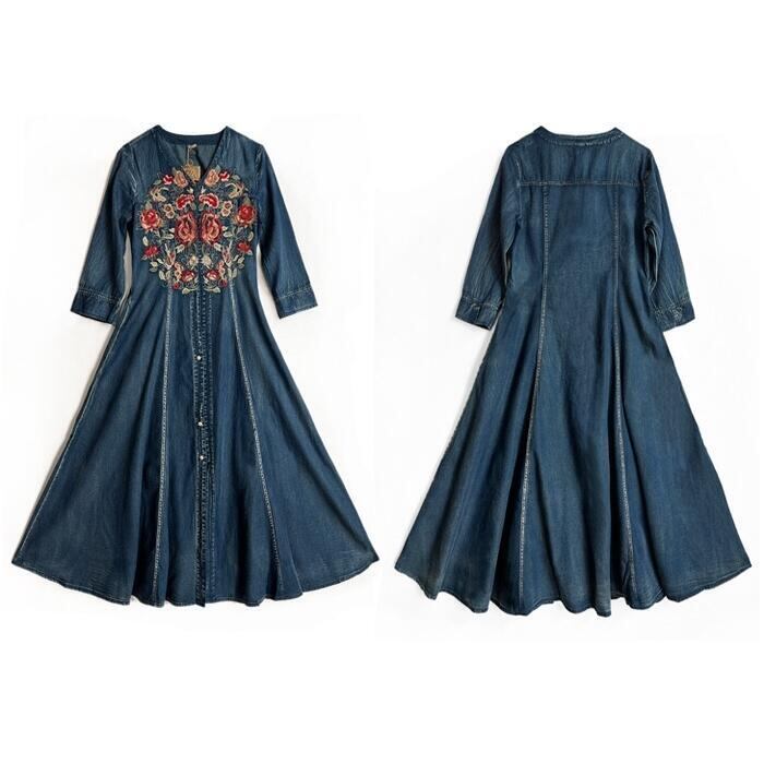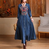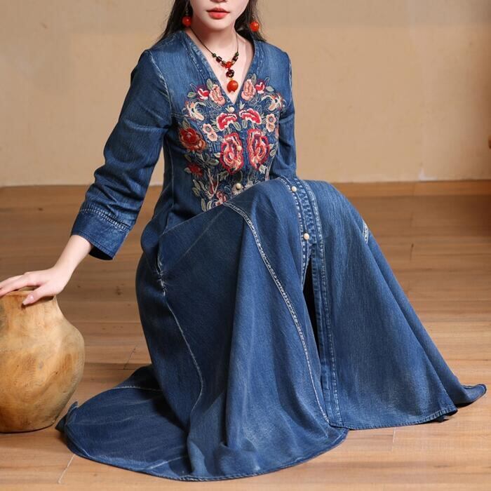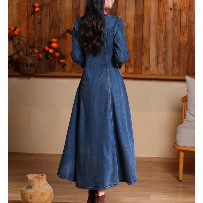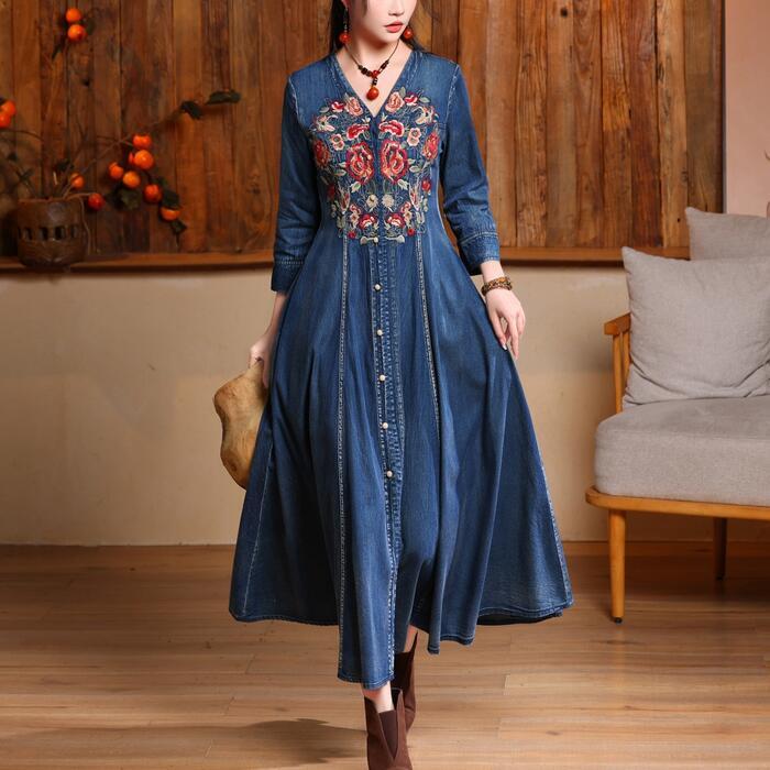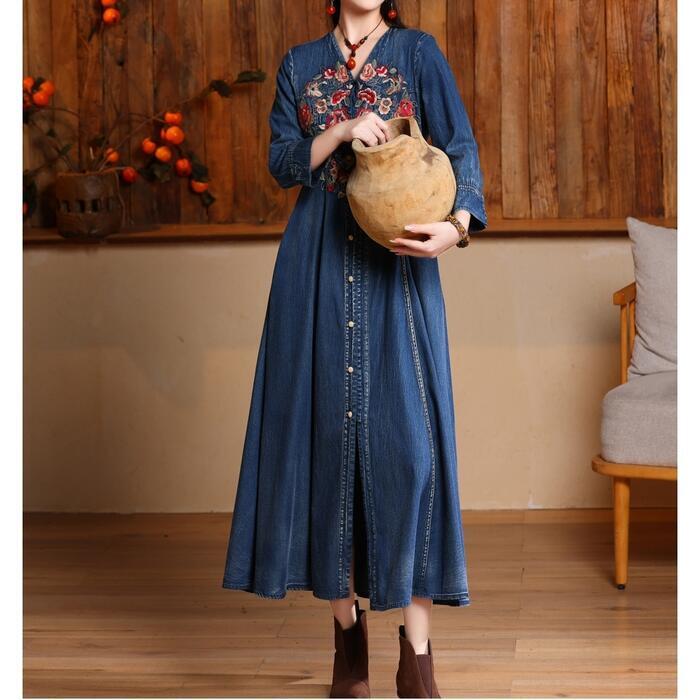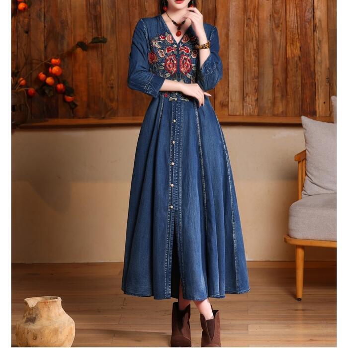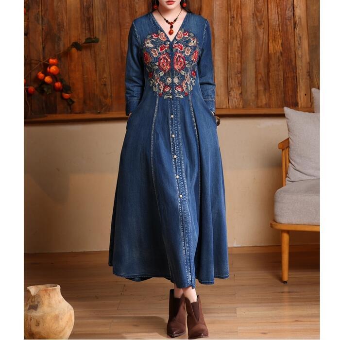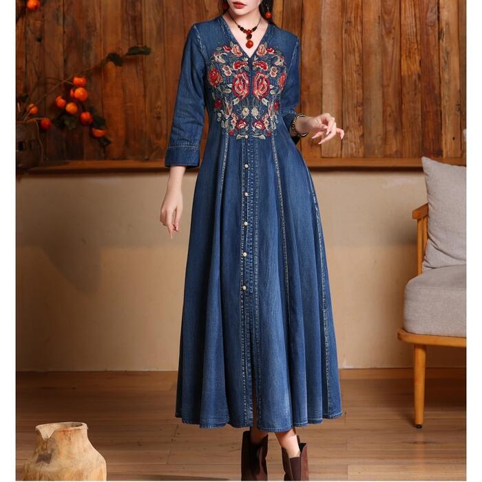 大きいサイズ 体型カバー エレガント フェミニン おしゃれ ワンピース ドレス レディース きれいめ カジュアル 大人可愛い 春 秋 冬 刺繍 花柄 長袖 Aライン デニム フレア ハイウエスト Vネック ロング丈 ブルー 青 20代 30代 40代 50代 M L