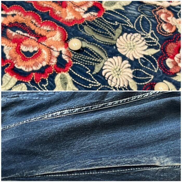 デニム地に色鮮やかな刺繍を贅沢に散りばめた、ノスタルジックなワンピース。