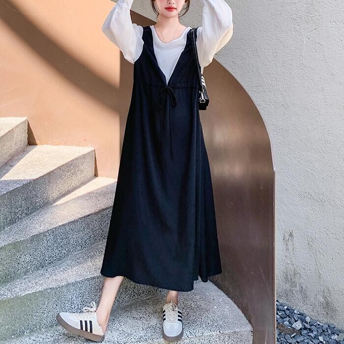 瞬時にお洒落が完成する、フェイクレイヤードデザインのロングワンピース。