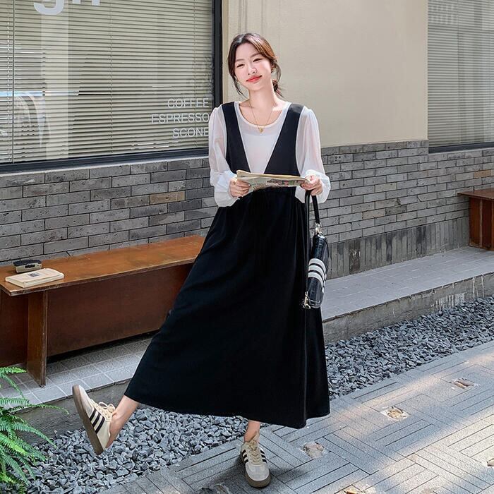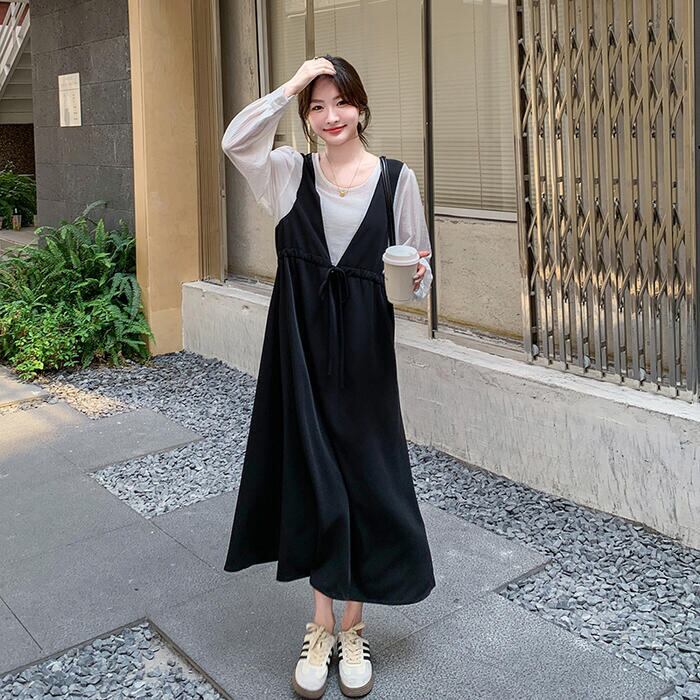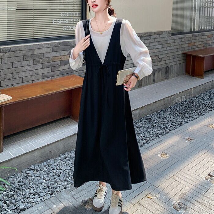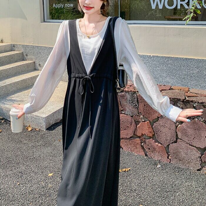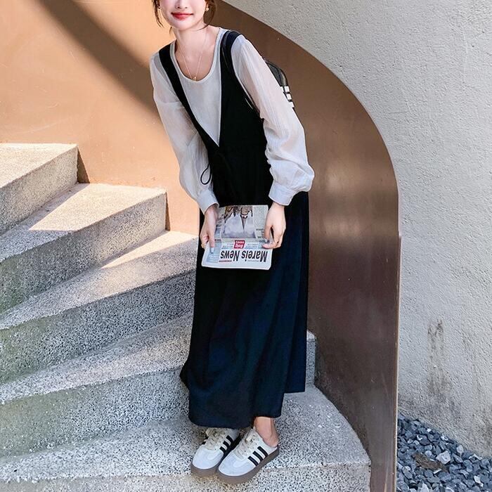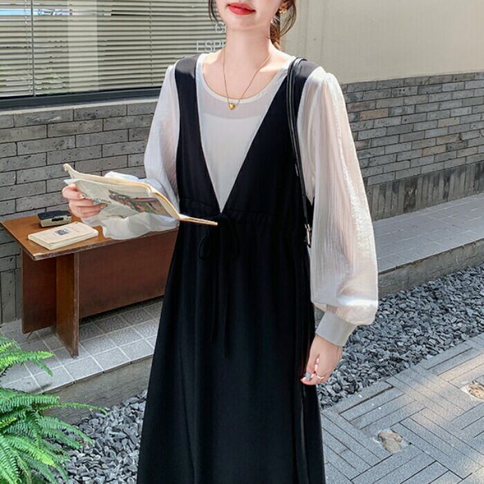 白ブラウスに黒のジャンパースカートを重ねたような、こなれ感たっぷりのスタイルがこれ一着で叶います。