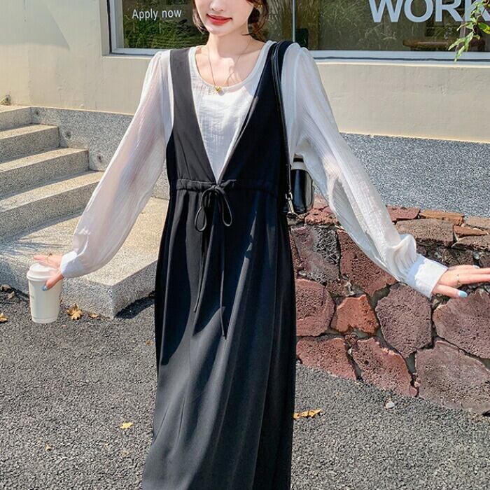 大きいサイズ 体型カバー エレガント フェミニン おしゃれ シンプル ワンピース ドレス レディース きれいめ カジュアル 大人可愛い 春 秋 夏 フェイクレイヤード 長袖 シアー 透け感 Aライン ドロスト フレア ハイウエスト ロング丈 バイカラー 配色 ブラック 20代 30代 40代 50代 S M L