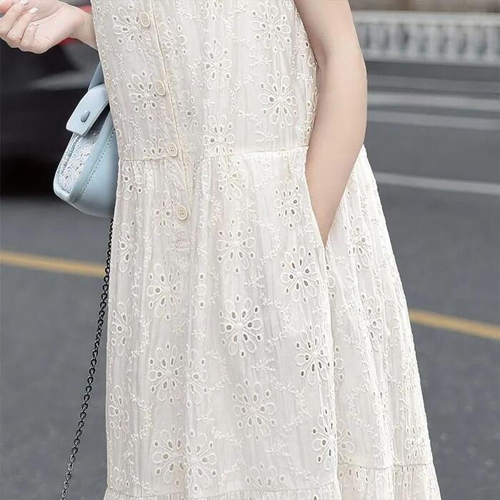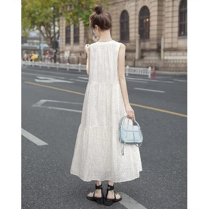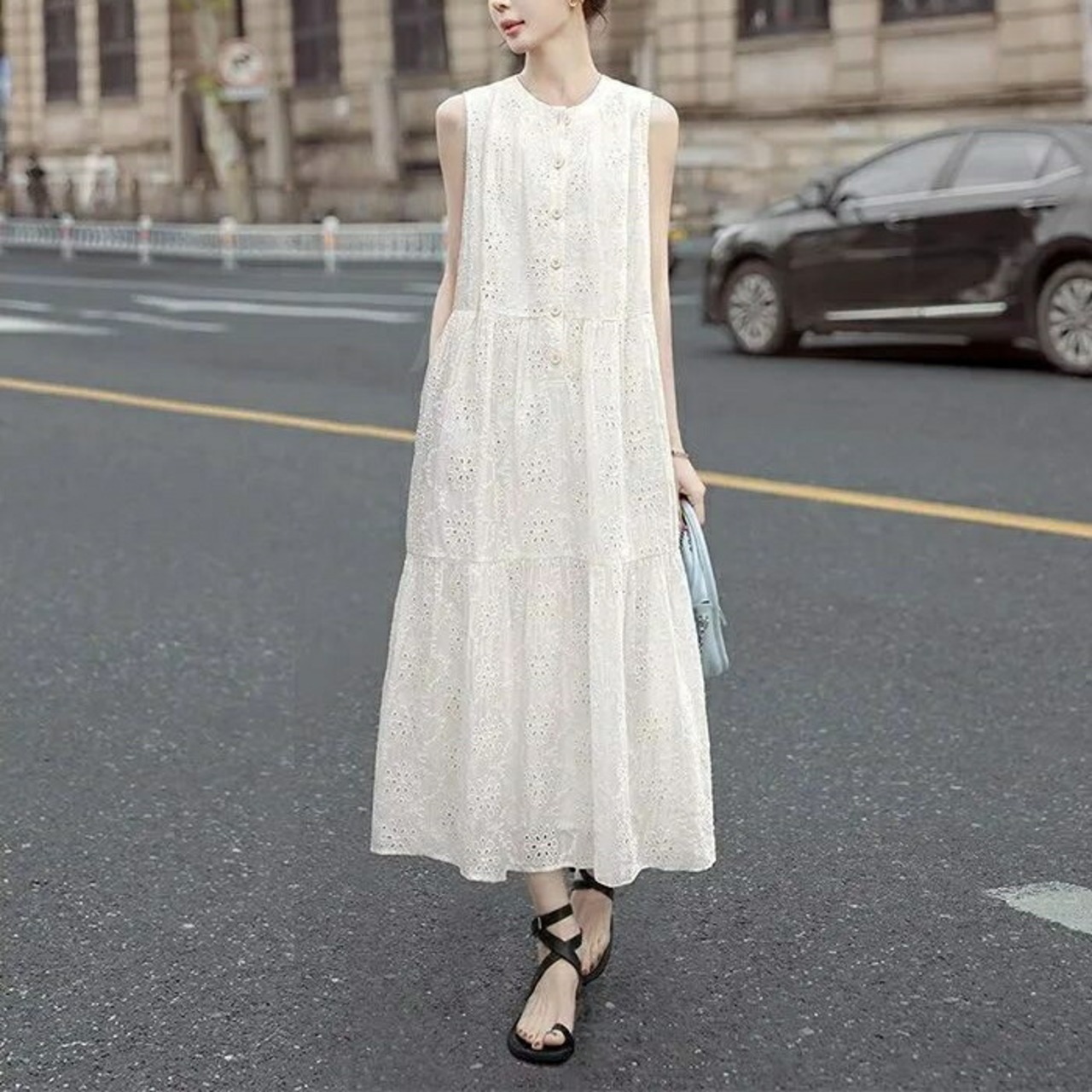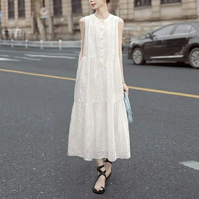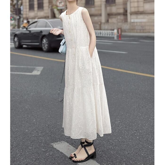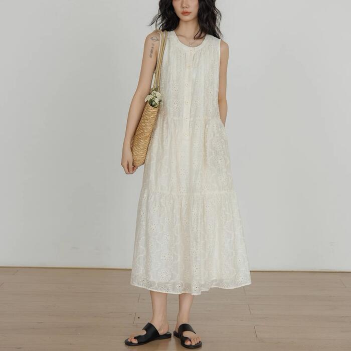 スッキリとしたノースリーブのアイレットレースワンピース。