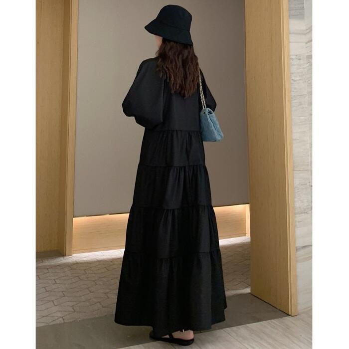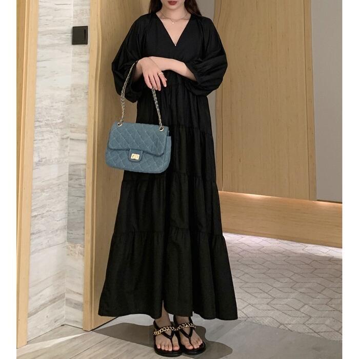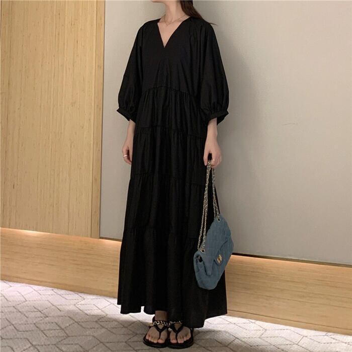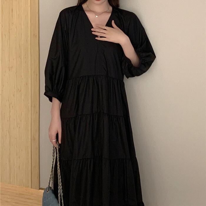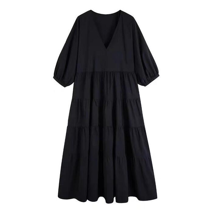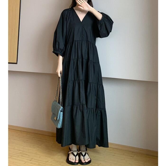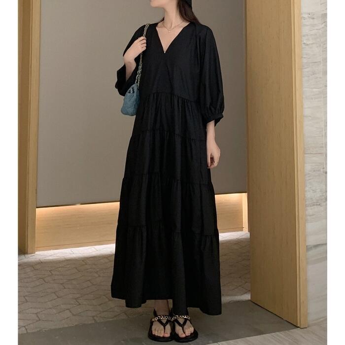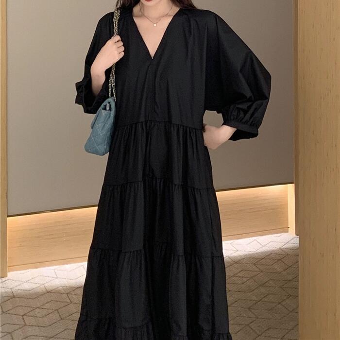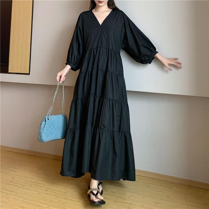 大きいサイズ 体型カバー エレガント フェミニン おしゃれ シンプル ナチュラル ワンピース ドレス レディース きれいめ カジュアル 大人可愛い 春 秋 夏 七分袖 ティアード Vネック Aライン フレア パフスリーブ ロング丈 無地 ブラック 黒 20代 30代 40代 50代 XL 2XL 3XL 4XL