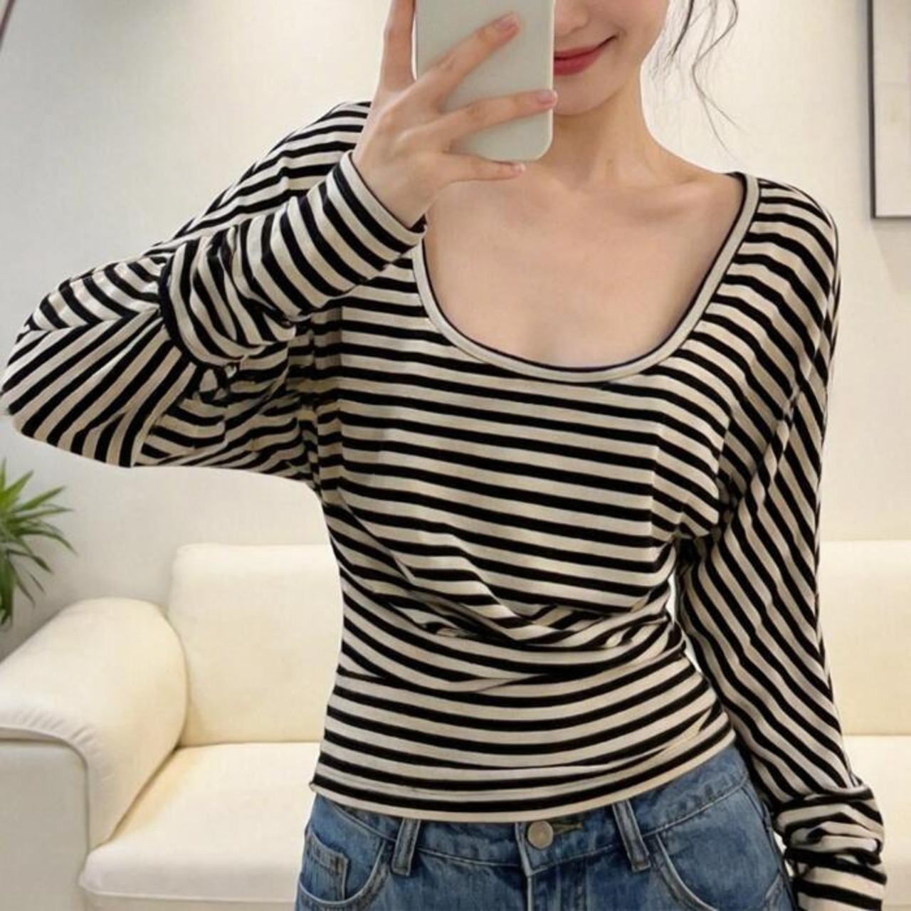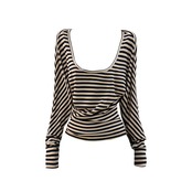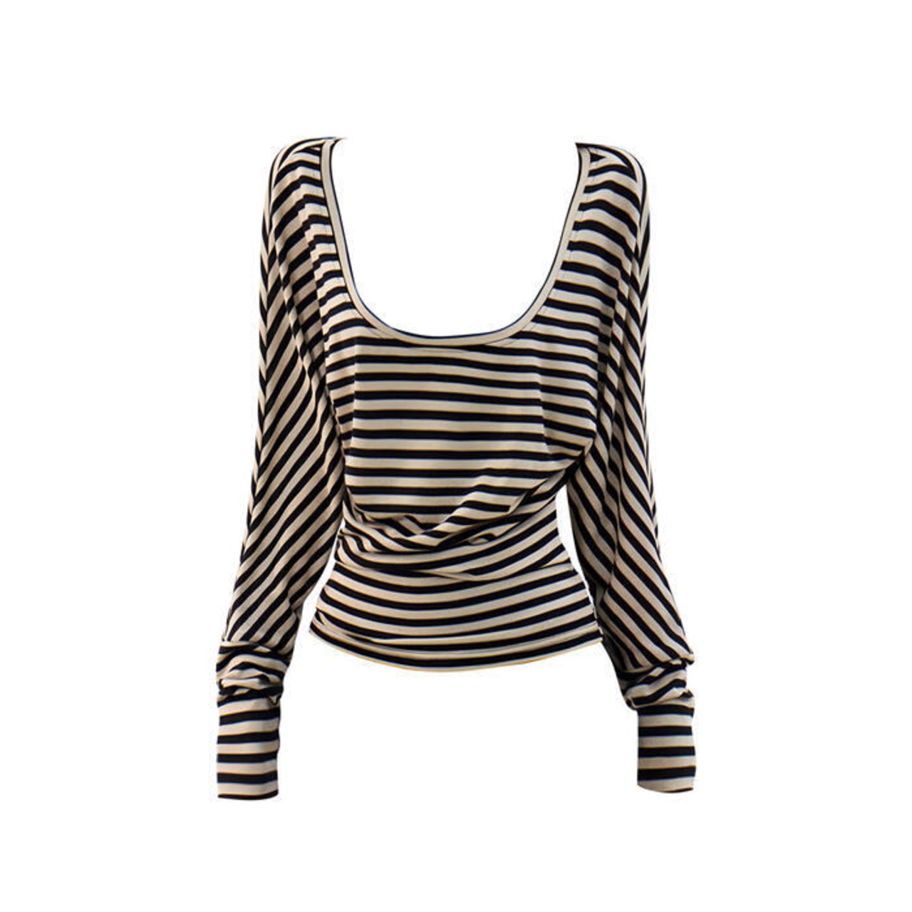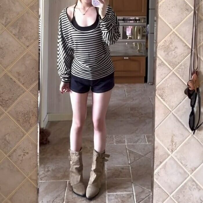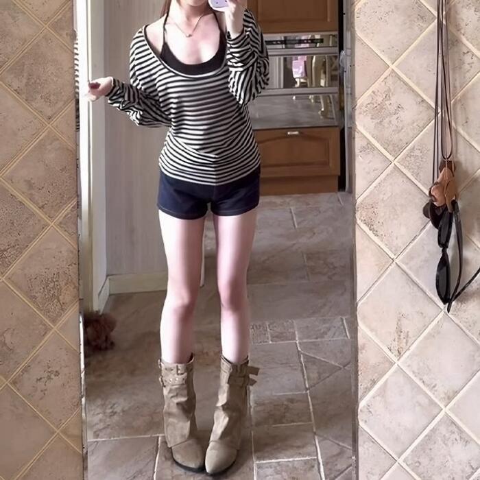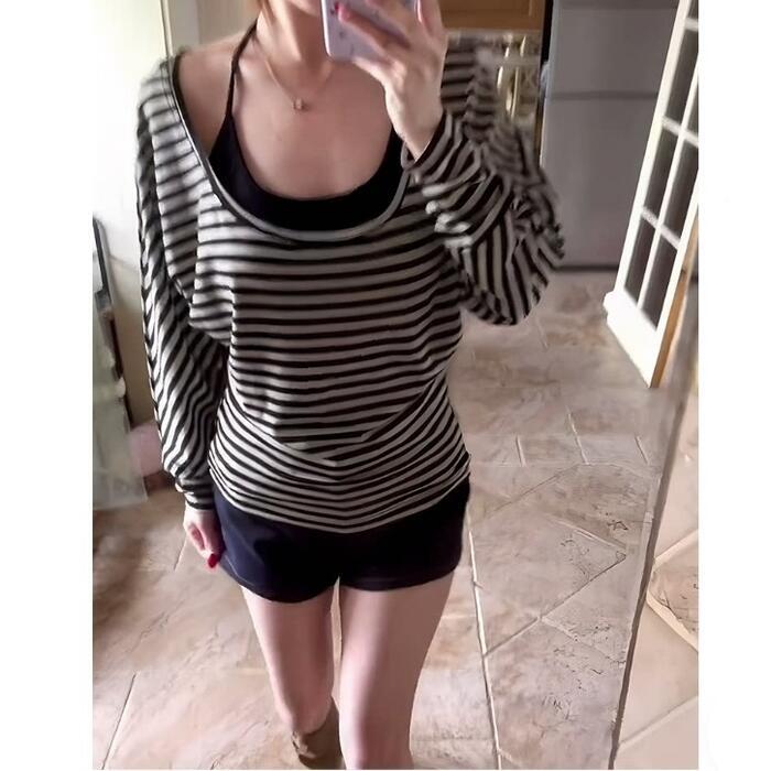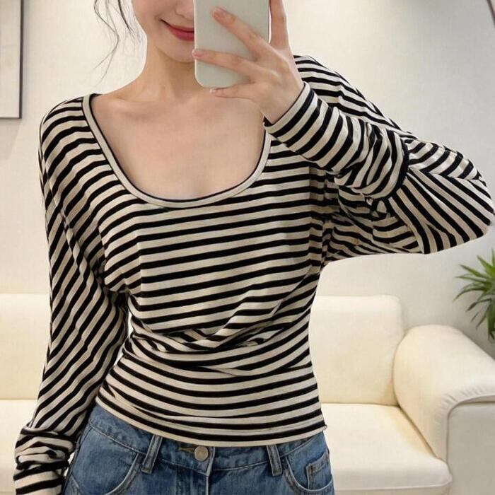 大きく開いたラウンドネックが魅力のボーダートップス。