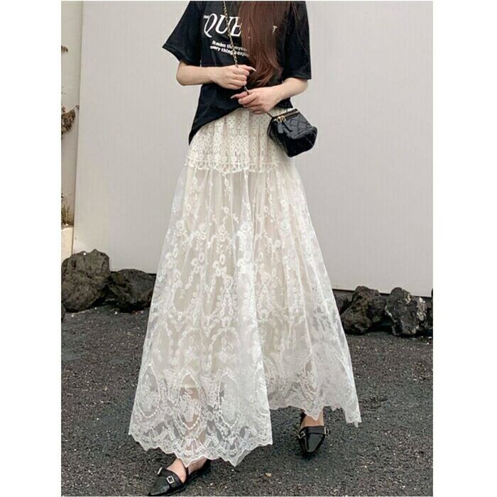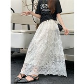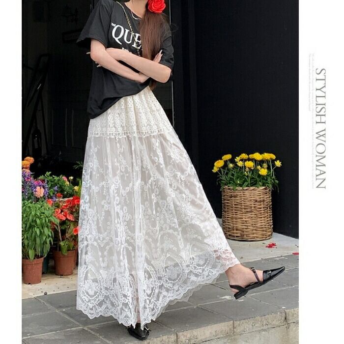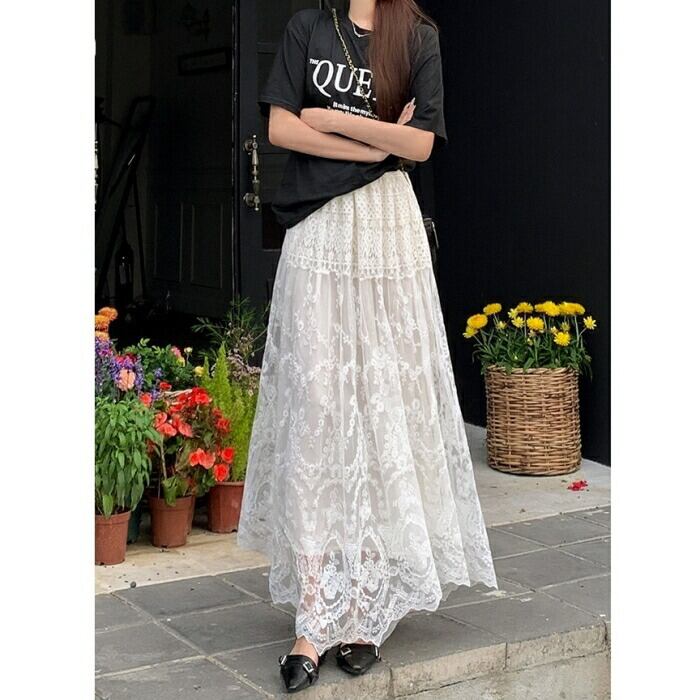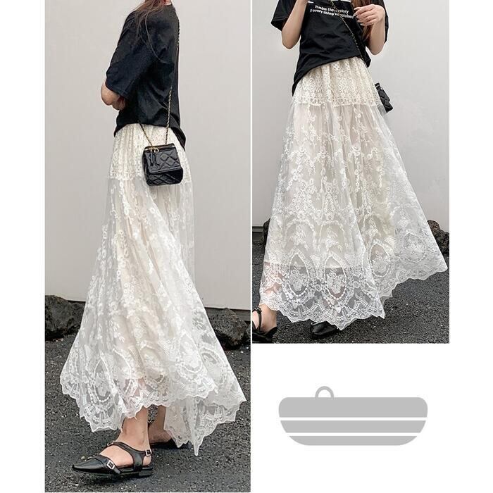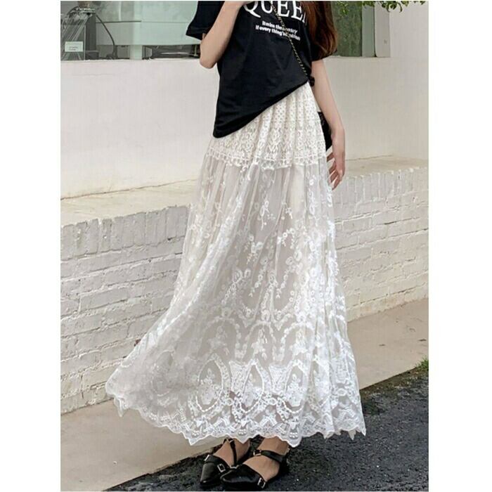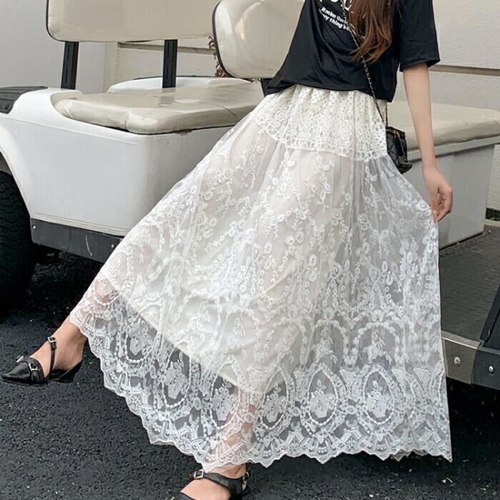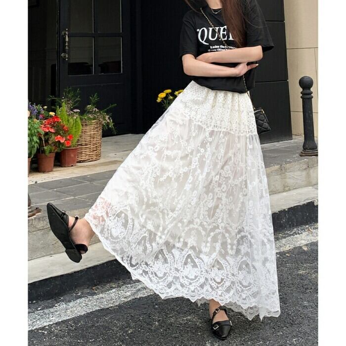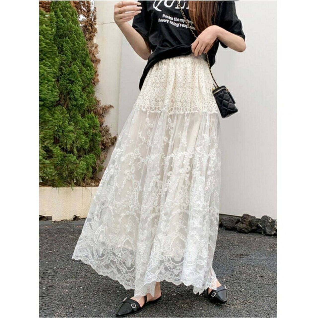 大きいサイズ 体型カバー エレガント フェミニン おしゃれ 楽ちん シンプル ボトムス スカート レディース きれいめ カジュアル 大人可愛い 春 秋 夏 冬 レース フレア ロング丈 ウエストゴム ハイウエスト 透け感 ホワイト 白 20代 30代 40代 50代 S M L XL