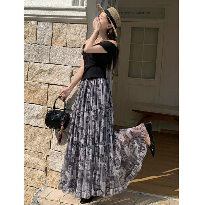 グラデーションが混ざり合うニュアンス柄が、夏のスタイルに涼やかさと奥行きを与えます。