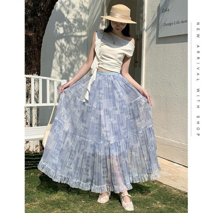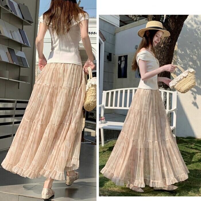 全3色 大きいサイズ 体型カバー エレガント フェミニン おしゃれ 楽ちん リゾート ボトムス スカート レディース きれいめ カジュアル 大人可愛い 春 秋 夏 ティアード フレア プリーツ フリル ロング丈 ウエストゴム ハイウエスト ベージュ ブルー 青 ブラック 黒 20代 30代 40代 50代 S M L XL
