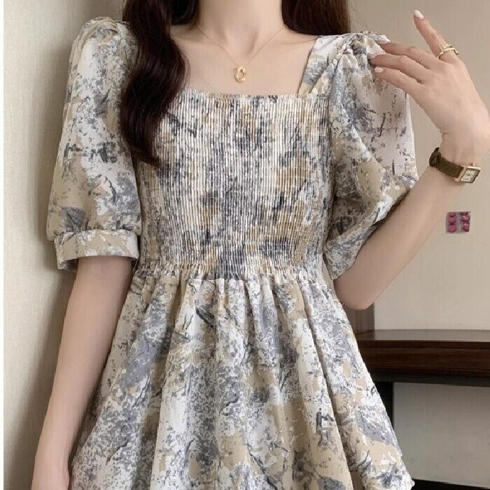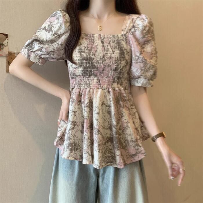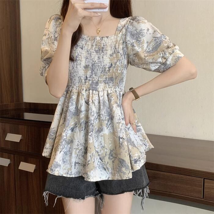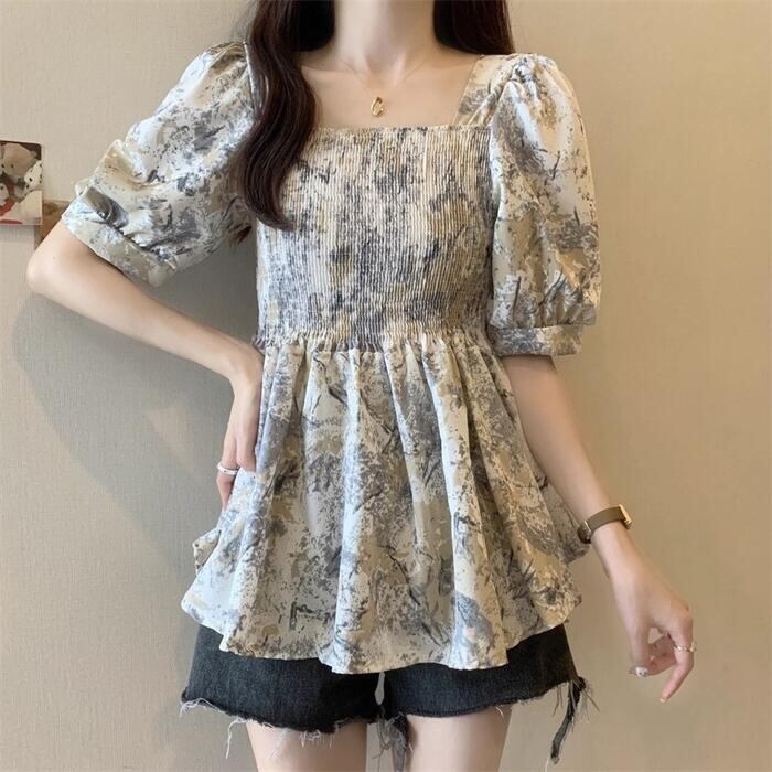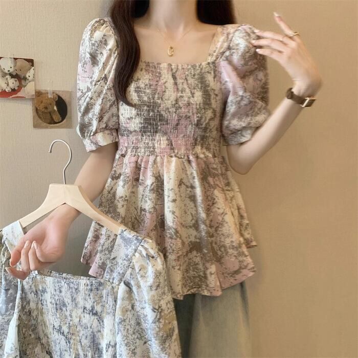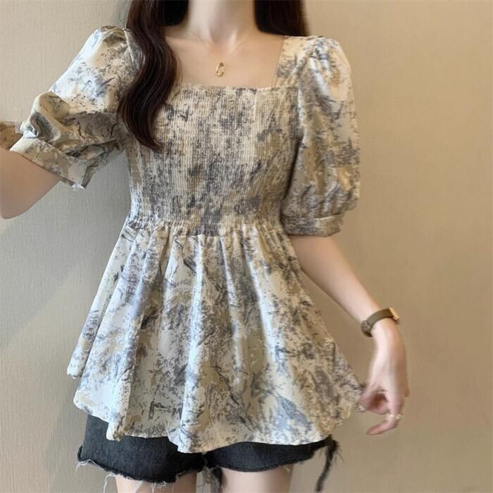 パフスリーブとスクエアネックが目を惹く、大人可愛い総柄トップス。