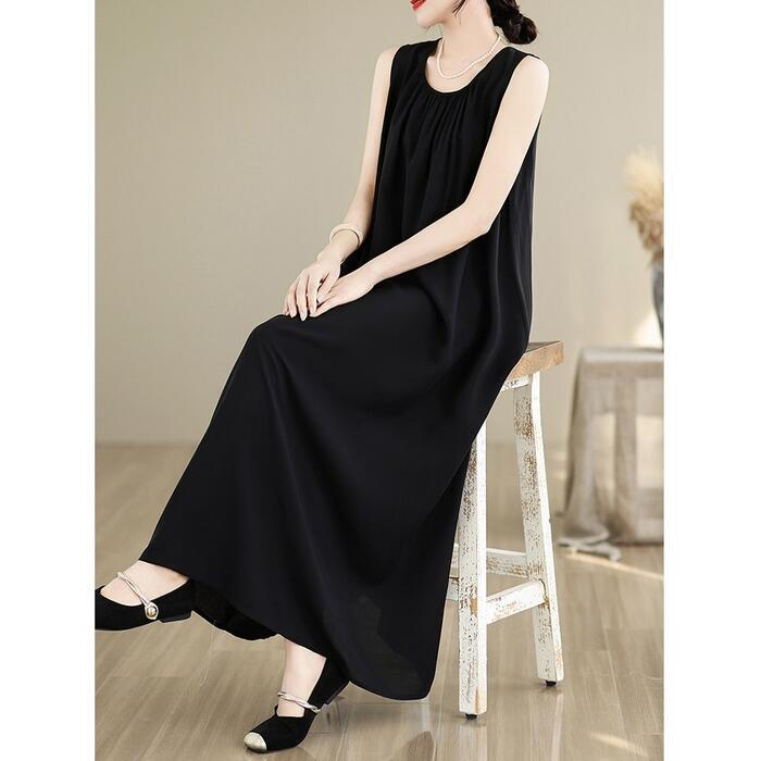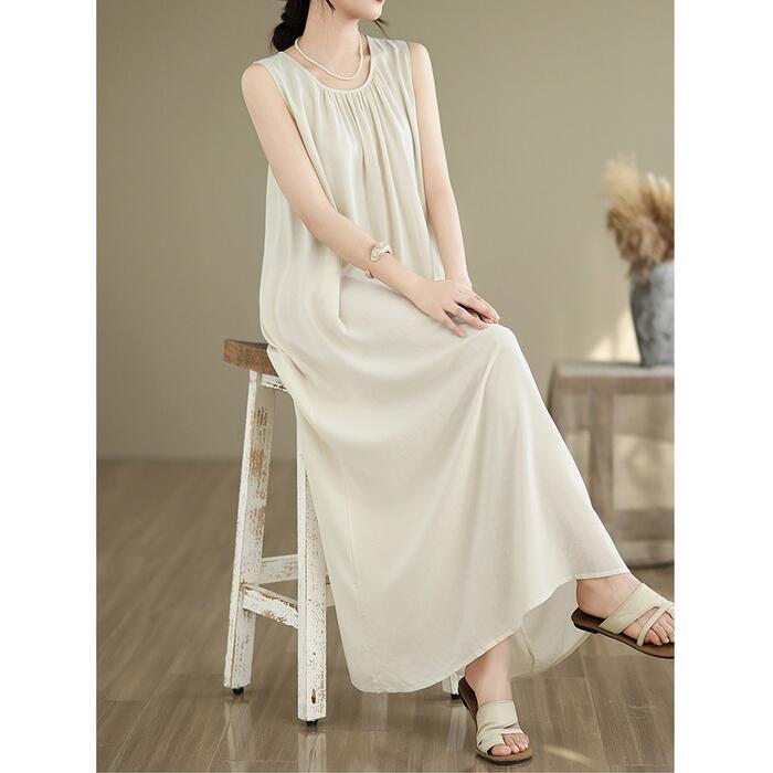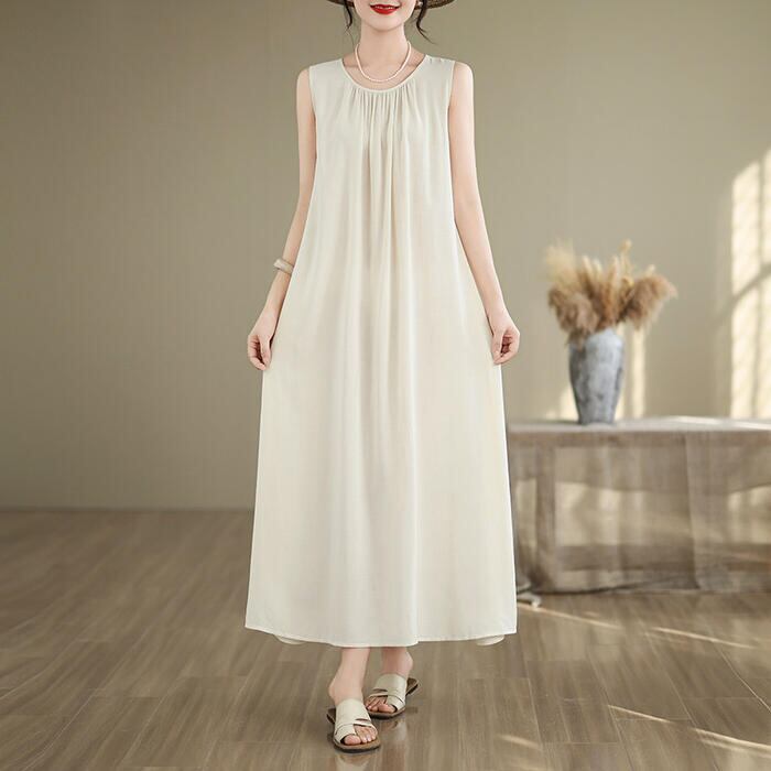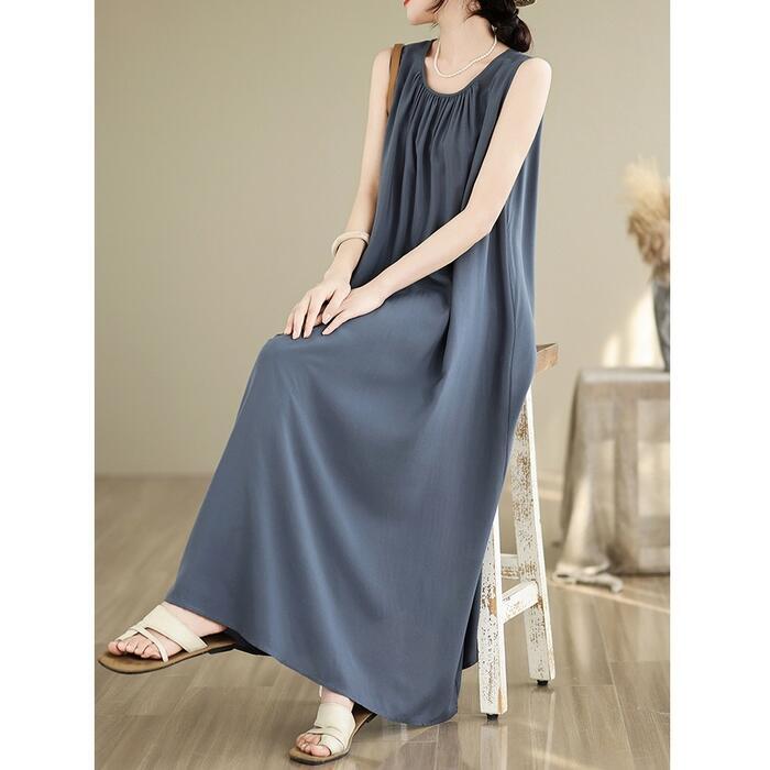 スッキリ見えを叶える、ノースリーブデザインのロングワンピース。