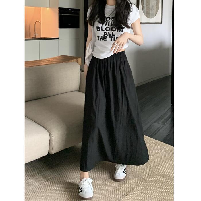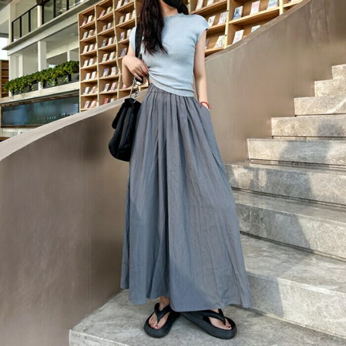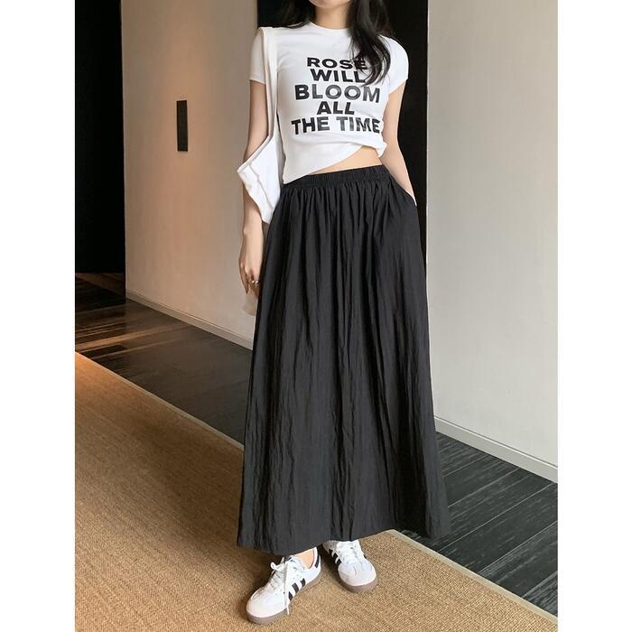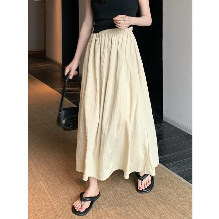 全4色 大きいサイズ 体型カバー エレガント フェミニン おしゃれ 楽ちん ボトムス スカート レディース きれいめ カジュアル 大人可愛い 春 秋 夏 フレア ロング丈 ウエストゴム ハイウエスト 無地 Aライン シワ加工 ベージュ ブラック 黒 グレー ピンク 20代 30代 40代 50代 S M L XL 2XL