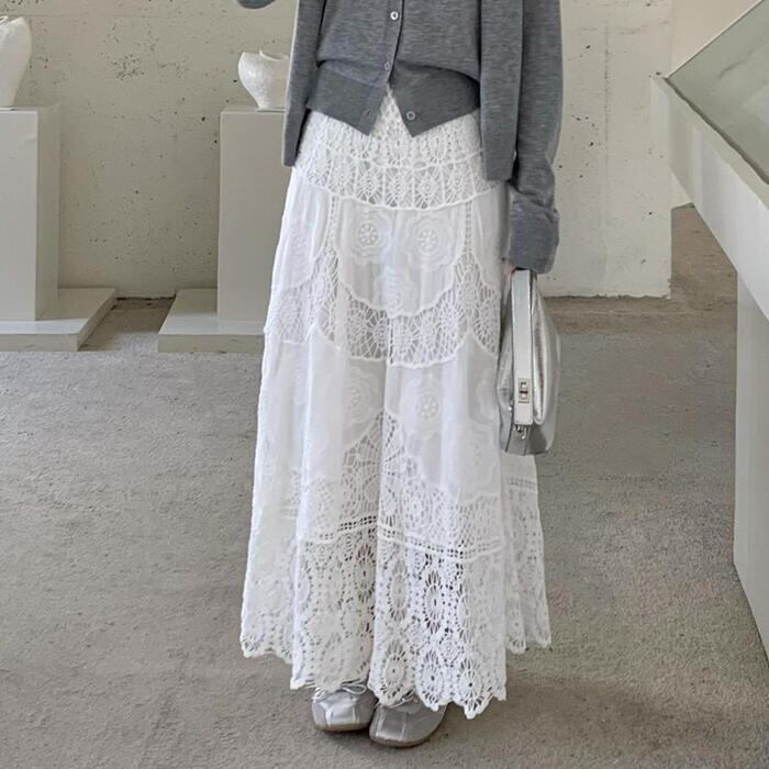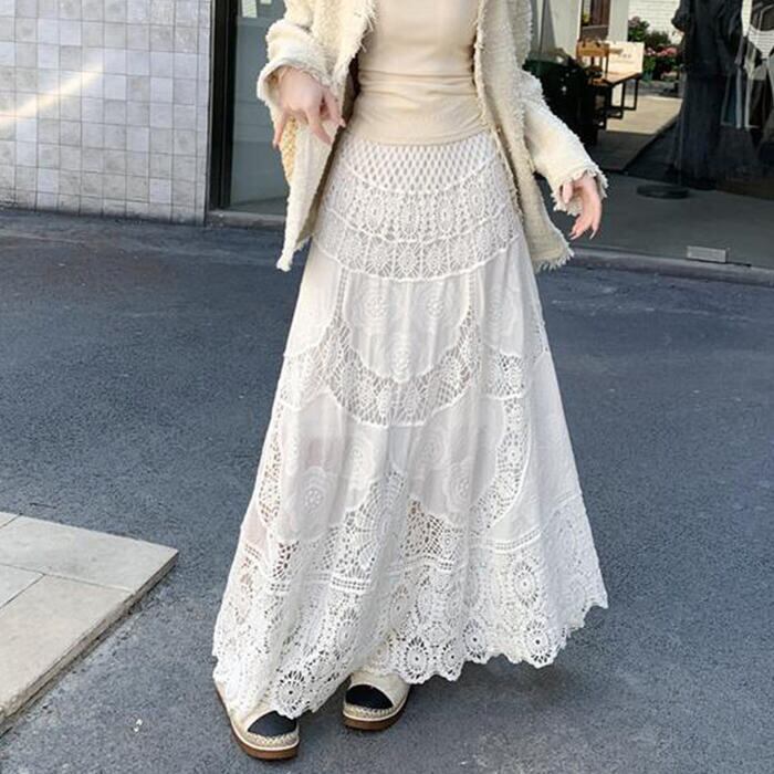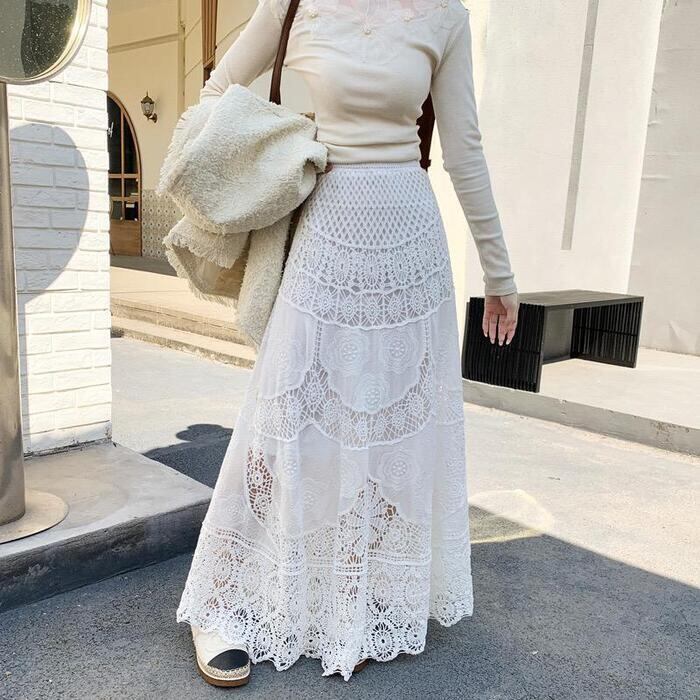 贅沢な総レース使いが目を惹く、ヴィンテージライクなロングスカート。