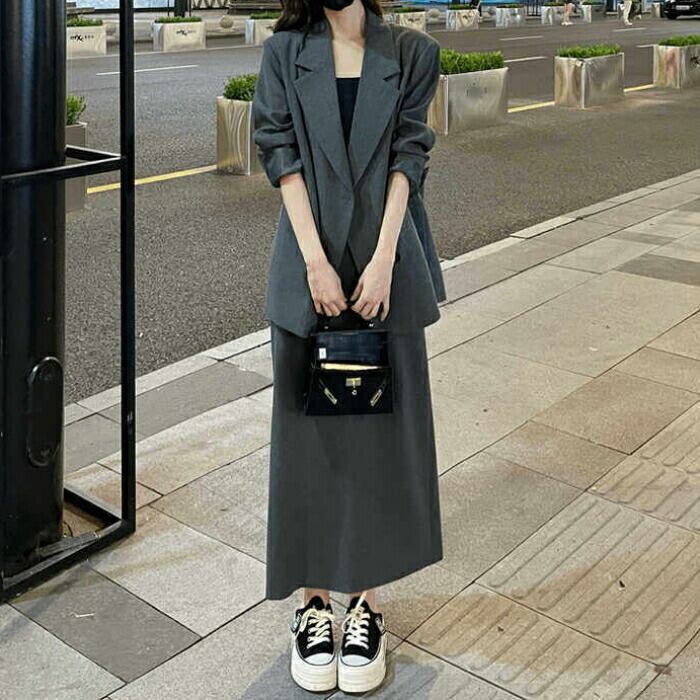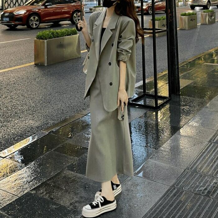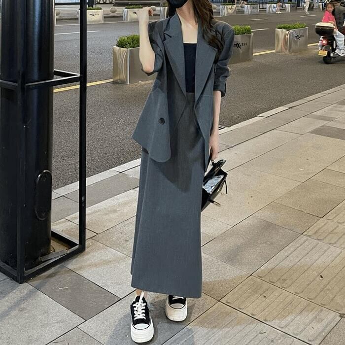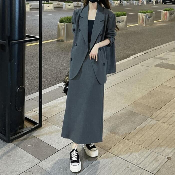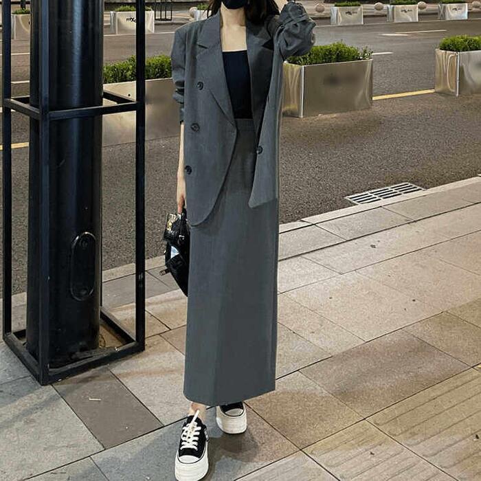 ダブルブレストテーラードジャケット&ロングスカートのセットアップです。