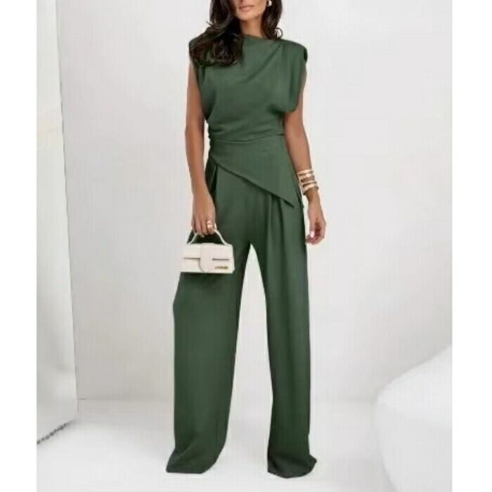 全6色 大きいサイズ 体型カバー エレガント フェミニン おしゃれ 2点セット セットアップ トップス パンツ 春 秋 夏 レディース きれいめ カジュアル 大人可愛い Tシャツ ロングパンツ アシンメトリー 無地 ノースリーブ グレー ホワイト 白 グリーン 緑 ベージュ 20代 30代 40代 50代 S M L XL 2XL