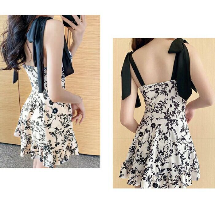 肩にあしらわれたブラックの大きなリボンが、甘いボタニカル柄にキリリとした表情をプラス。