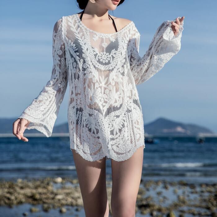 優雅な透け感と繊細なレースデザインが目を惹く、総レースの長袖トップス。