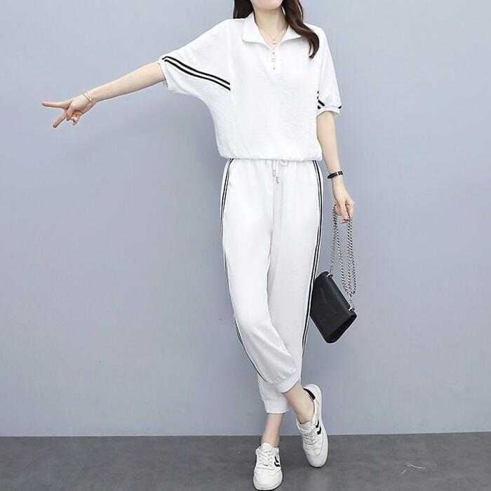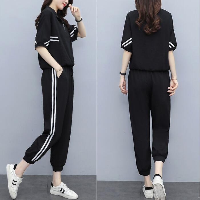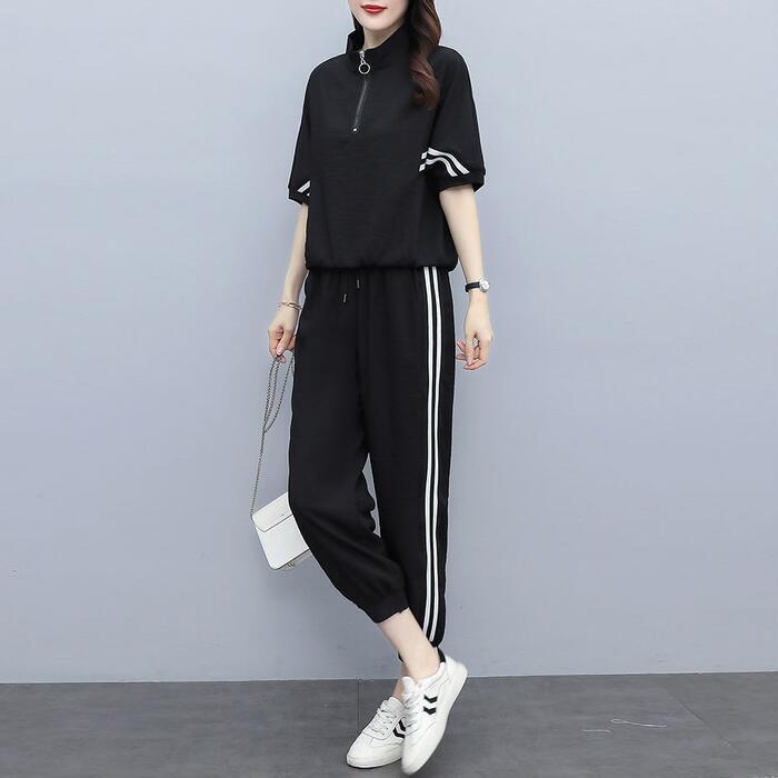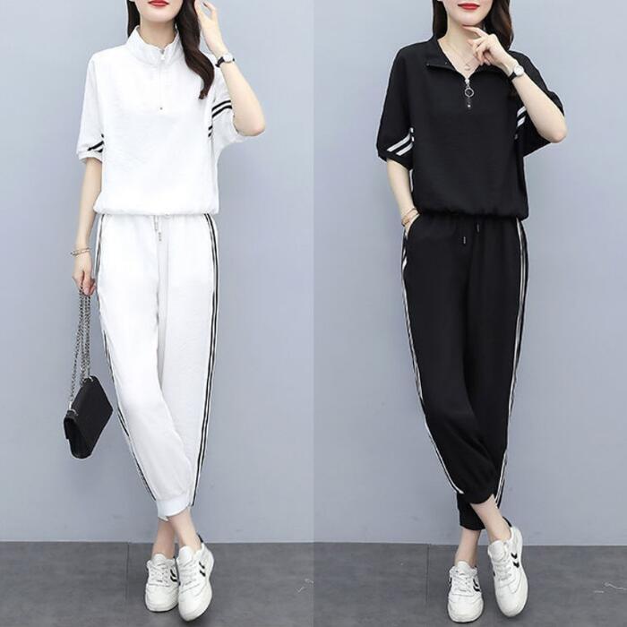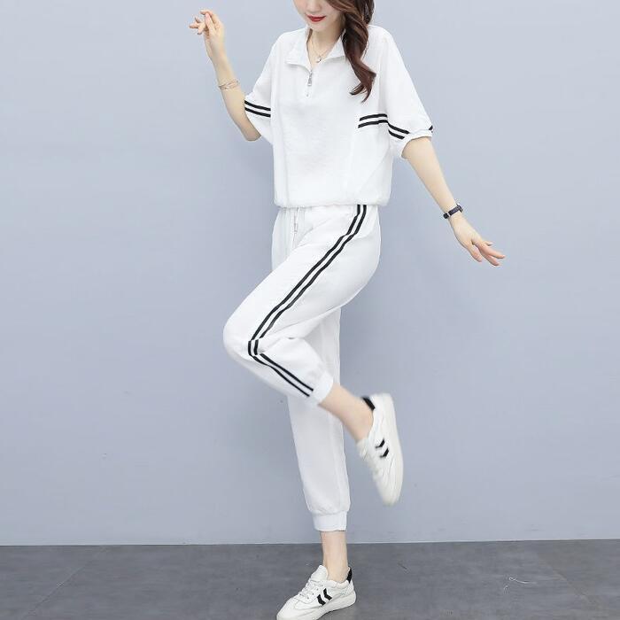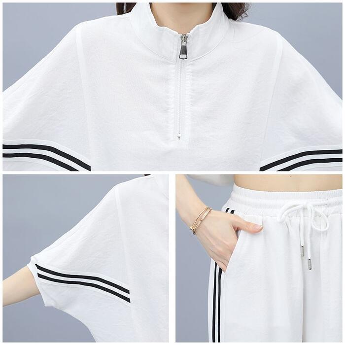 全2色 大きいサイズ 体型カバー エレガント フェミニン おしゃれ 2点セット ワンマイルウェア ルームウェア ドルマンスリーブ スポーティ セットアップ トップス パンツ 春 秋 夏 レディース きれいめ カジュアル 大人可愛い ジャージ クロップド丈 ジョガーパンツ ライン ハーフジップ 半袖 ブラック 黒 ホワイト 白 20代 30代 40代 50代 S M L XL 2XL