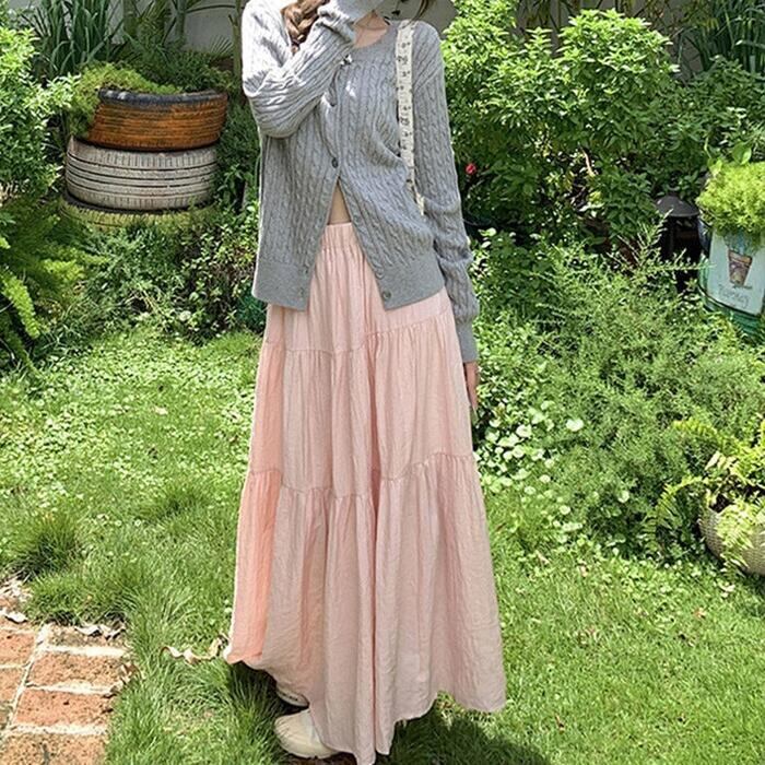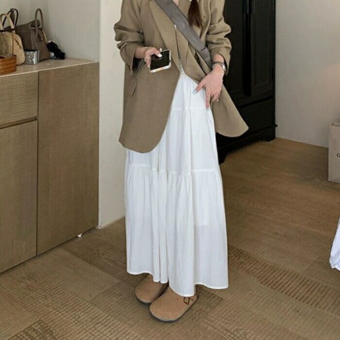 全4色 大きいサイズ 体型カバー エレガント フェミニン おしゃれ 楽ちん ボトムス スカート レディース きれいめ カジュアル 大人可愛い 春 秋 夏 フレア ロング丈 ウエストゴム ティアード 無地 Aライン シワ加工 ホワイト 白 ブラック 黒 ブルー 青 ピンク 20代 30代 40代 50代 S M L XL