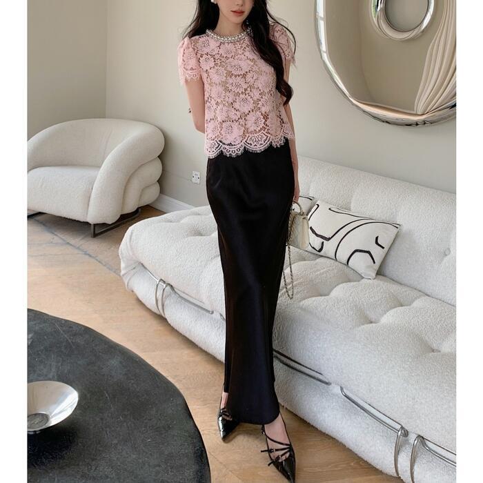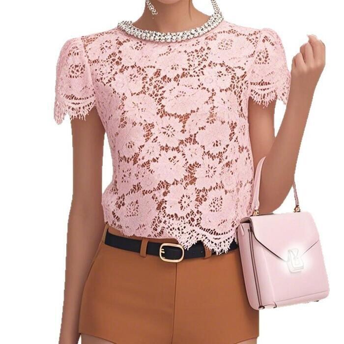 着るだけでパッと華やかになる、総レース半袖ブラウスです。