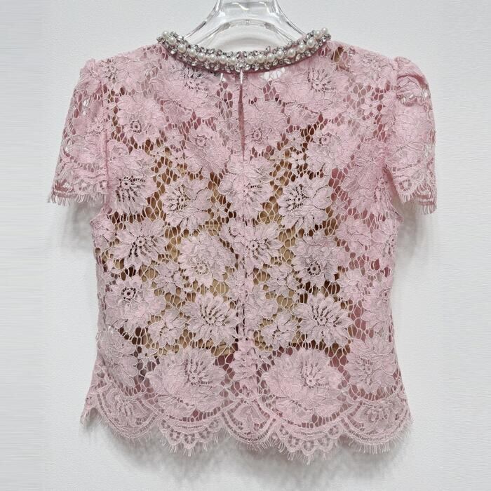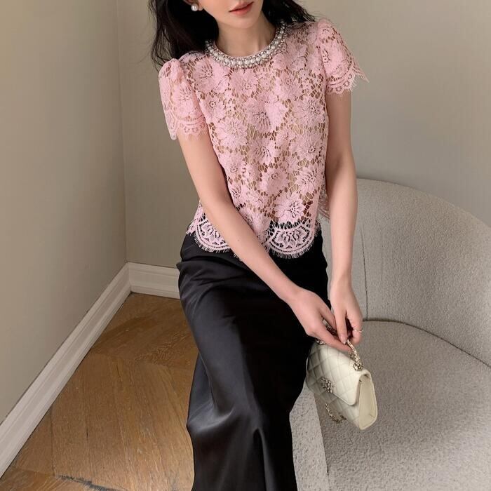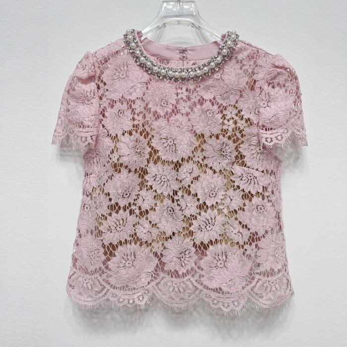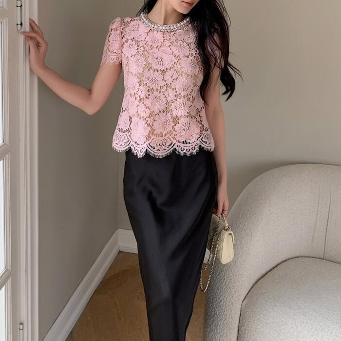 大きいサイズ 体型カバー エレガント フェミニン おしゃれ お呼ばれ オケージョン トップス シャツ ブラウス レディース きれいめ カジュアル 大人可愛い 春 秋 夏 半袖 レース パフスリーブ パール ビジュー スカラップレース ピンク 20代 30代 40代 50代 S M L