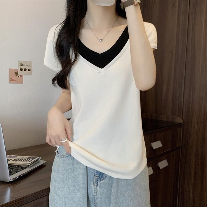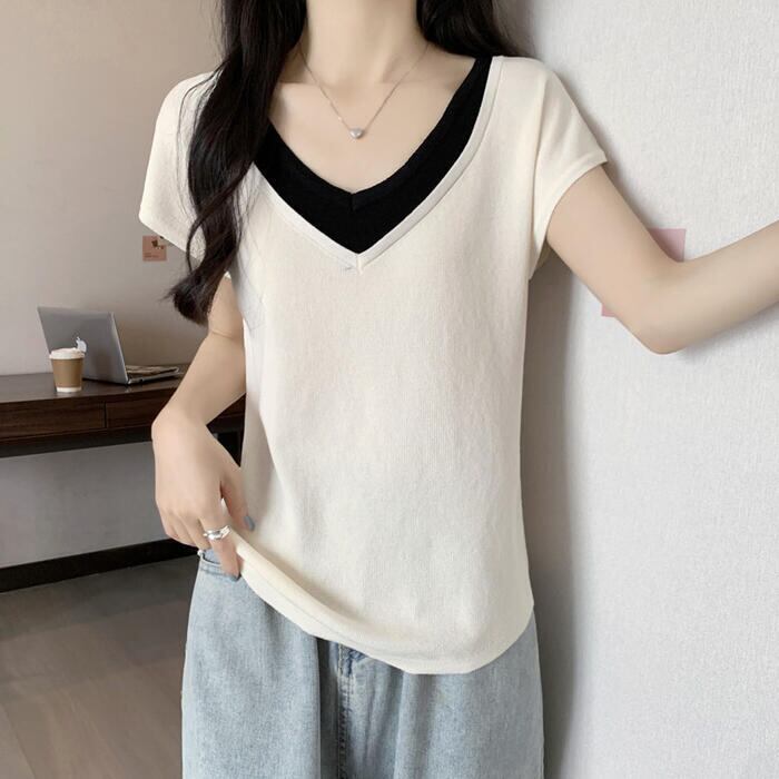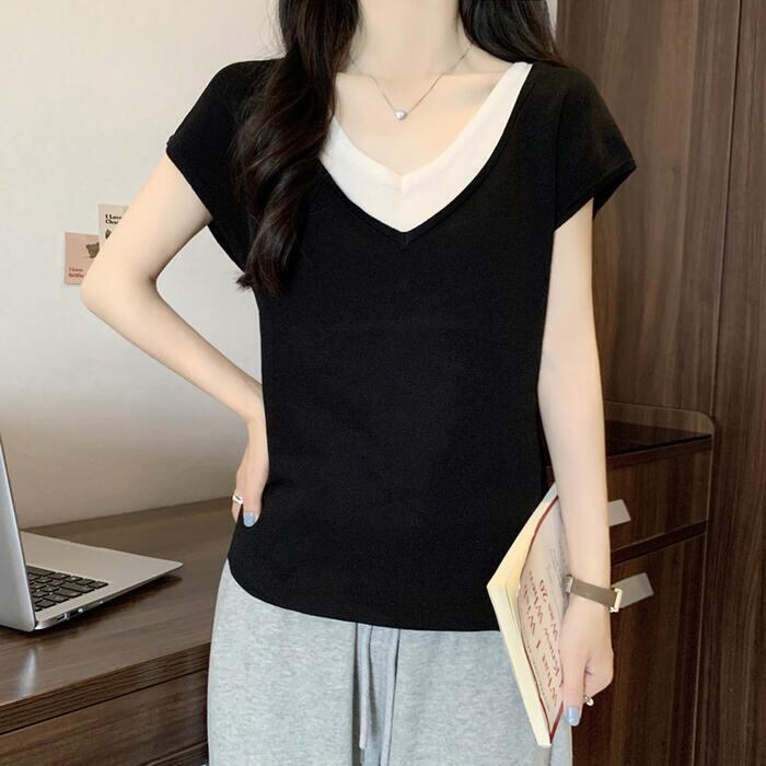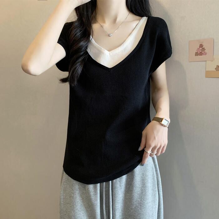 全2色 大きいサイズ 体型カバー エレガント フェミニン おしゃれ シンプル 重ね着 トップス Tシャツ カットソー レディース きれいめ カジュアル 大人可愛い 春 秋 夏 半袖 レイヤード風 Vネック 無地 ブラック 黒 ホワイト 白 20代 30代 40代 50代 M L XL 2XL 3XL 4XL