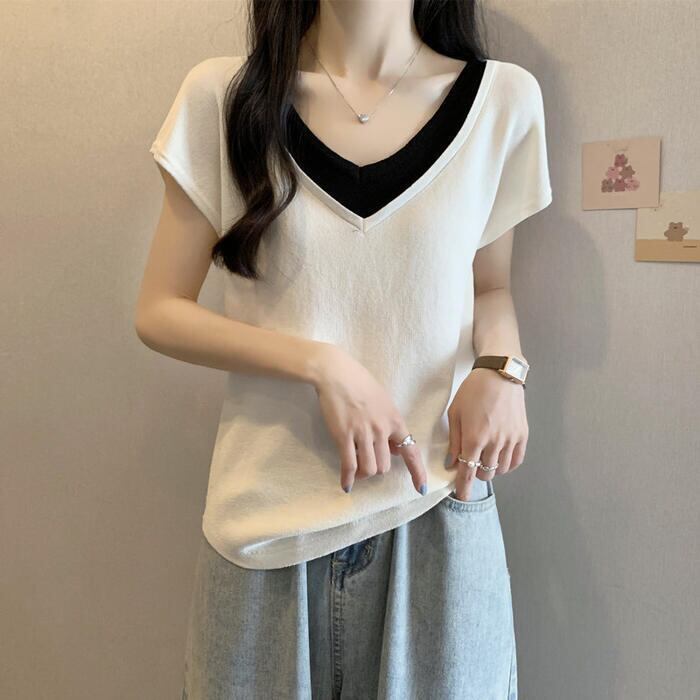 Vネックからチラリと覗くインナー風のラインが、お顔周りをスッキリと華奢に見せてくれます。