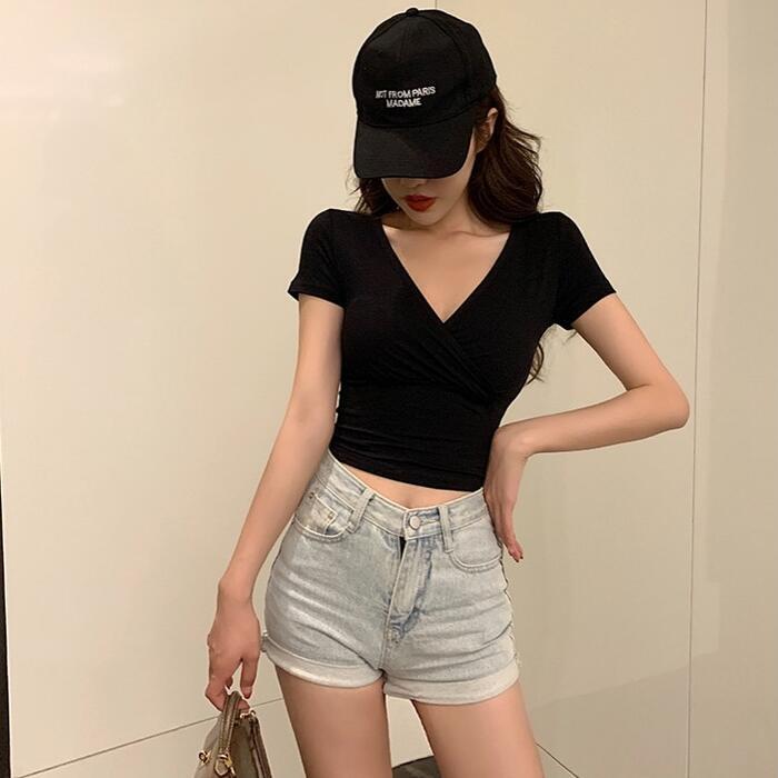 全4色 大きいサイズ 体型カバー エレガント フェミニン おしゃれ シンプル トップス Tシャツ カットソー レディース きれいめ カジュアル 大人可愛い 春 秋 夏 半袖 カシュクール 無地 ショート丈 クロップド丈 Vネック ブラック 黒 グレー ホワイト 白 ベージュ 20代 30代 40代 50代 S M L XL