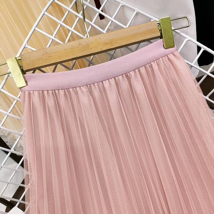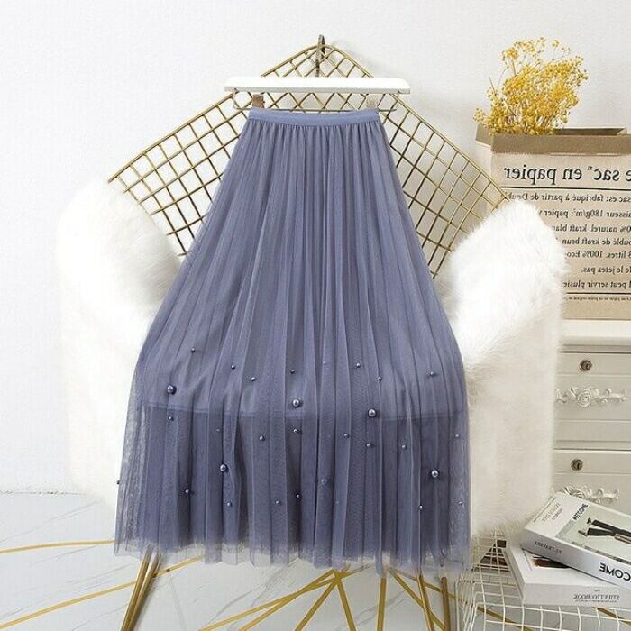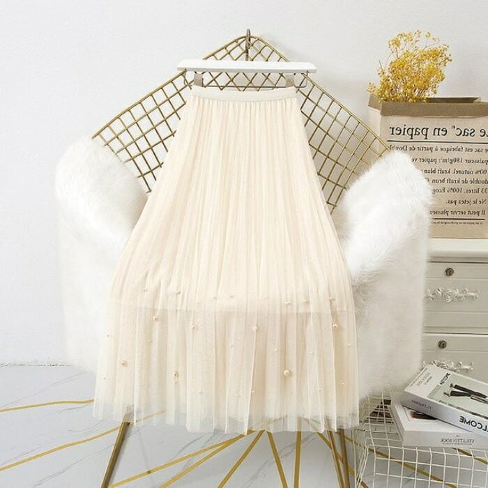 裾にかけてパールをあしらった、チュールプリーツスカート。