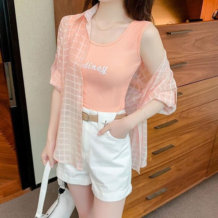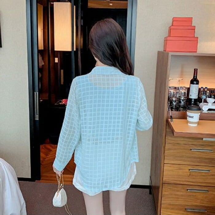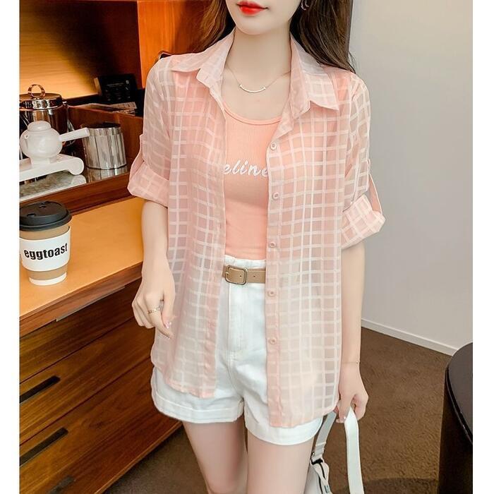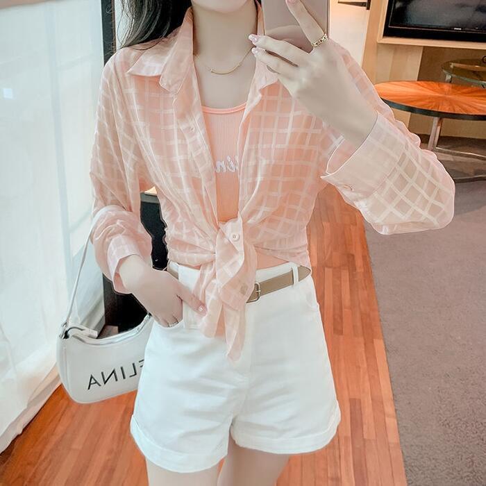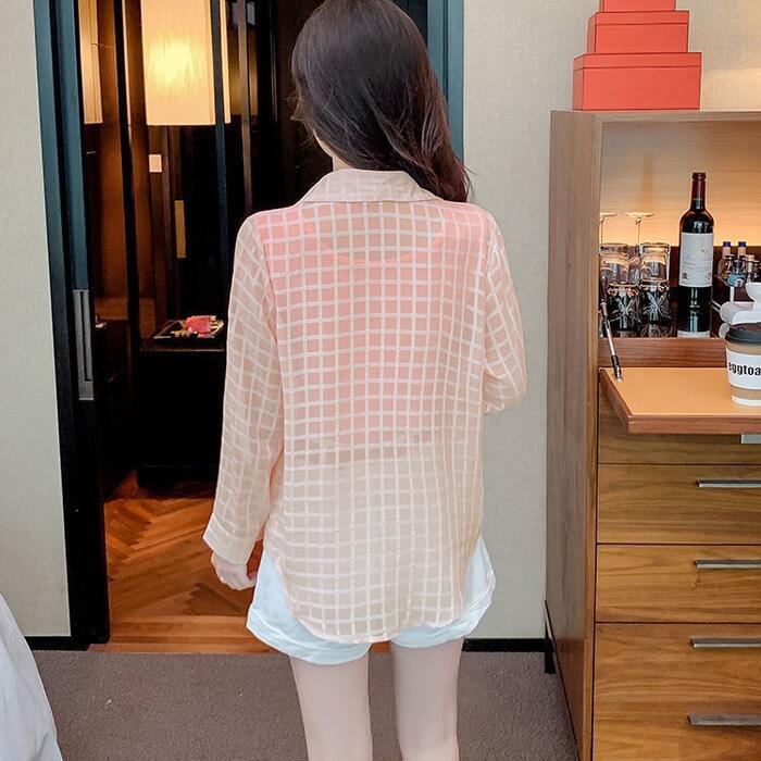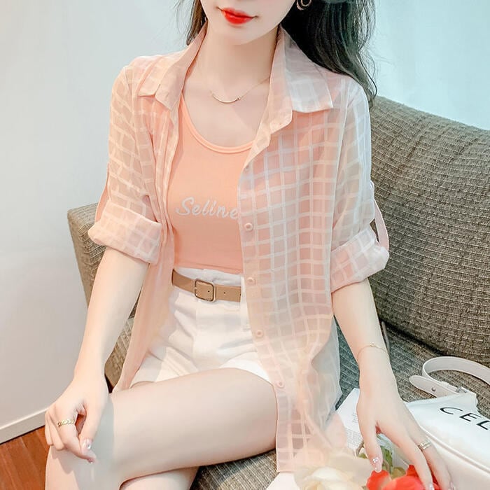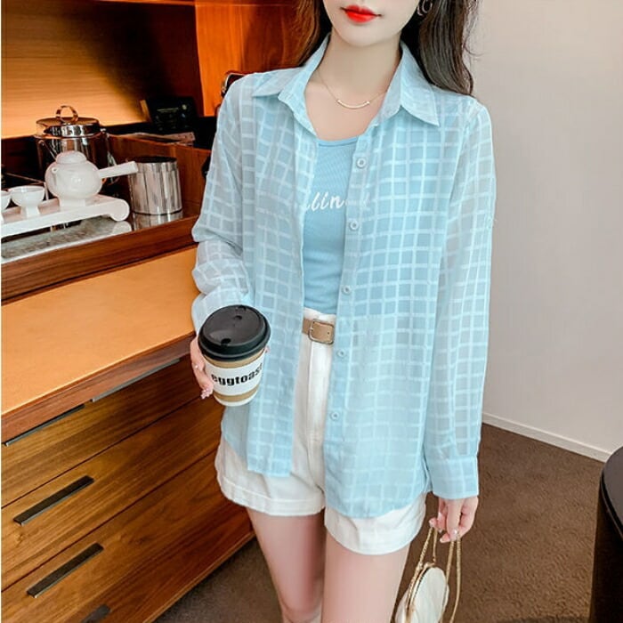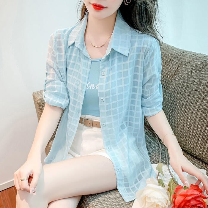 全2色 大きいサイズ 体型カバー エレガント フェミニン おしゃれ シンプル 日焼け防止 冷房対策 トップス シャツ ブラウス レディース きれいめ カジュアル 大人可愛い 春 秋 夏 長袖 五分袖 チェック 透け感 羽織り 襟付き ブルー 青 ピンク 20代 30代 40代 50代 S M L XL