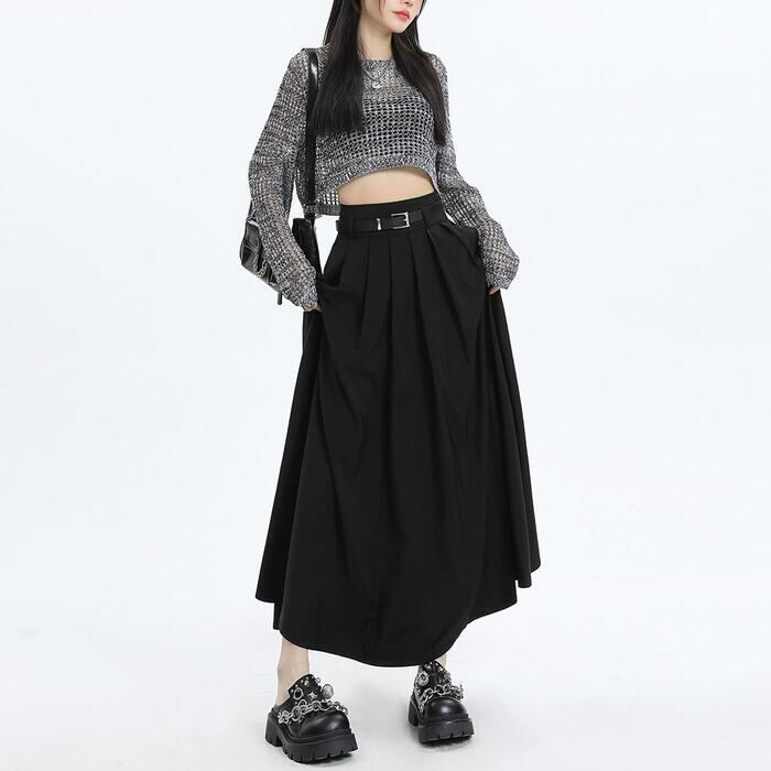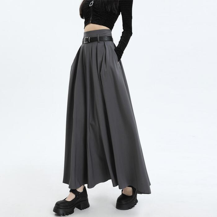 全2種2色 大きいサイズ 体型カバー エレガント フェミニン おしゃれ シンプル ショートサイズ スカート レディース 春 秋 夏 冬 ボトムス きれいめ カジュアル 大人可愛い フレア ロング丈 プリーツ マキシ丈 ハイウエスト ウエストベルト ブラック 黒 グレー 20代 30代 40代 50代 S M L XL