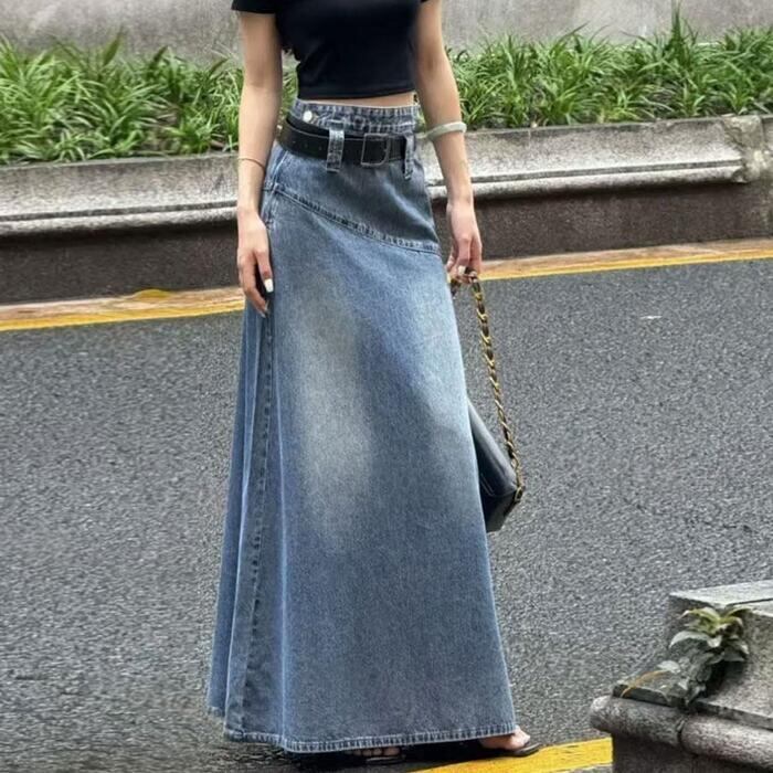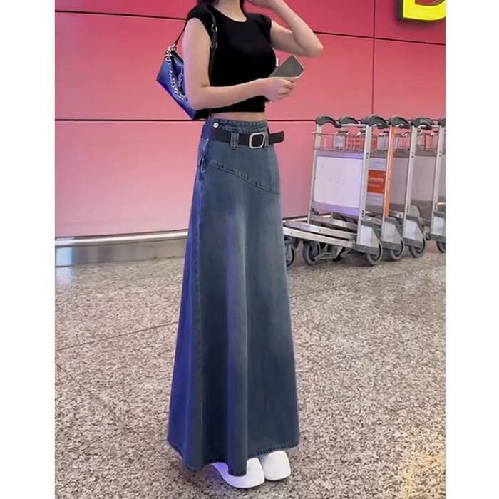 大きいサイズ 体型カバー エレガント フェミニン おしゃれ シンプル スカート レディース 春 秋 夏 冬 ボトムス きれいめ カジュアル 大人可愛い デニム フレア ロング丈 マキシ丈 ハイウエスト ビンテージ ダメージ ブルー 青 20代 30代 40代 50代 S M L XL