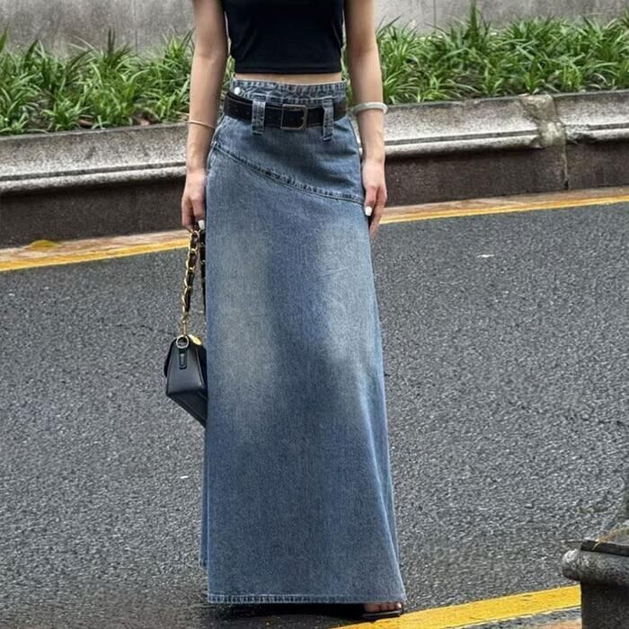 ヴィンテージライクな色落ち加工と切り替えデザインがポイントのデニムロングスカートです。