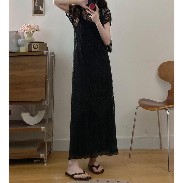 繊細な総レースの半袖ワンピースと、キャミソールワンピースを重ねたレイヤードセット。