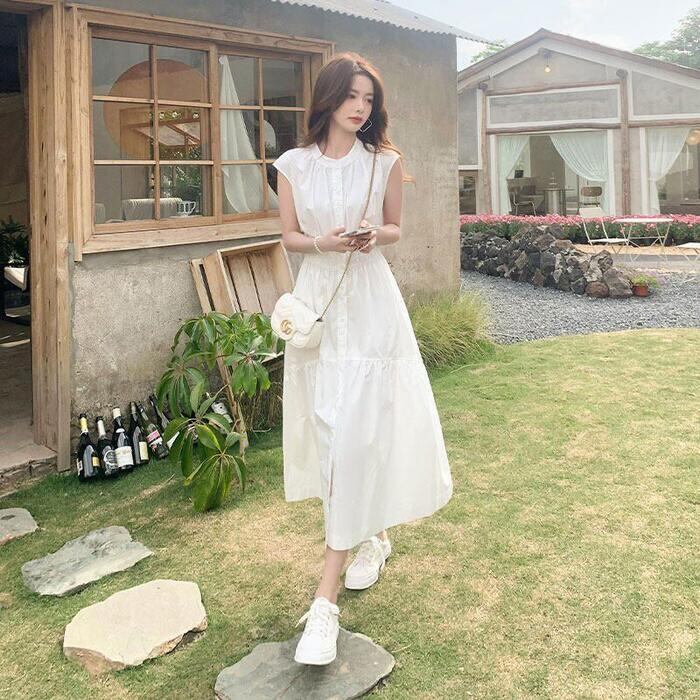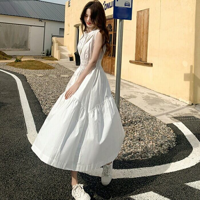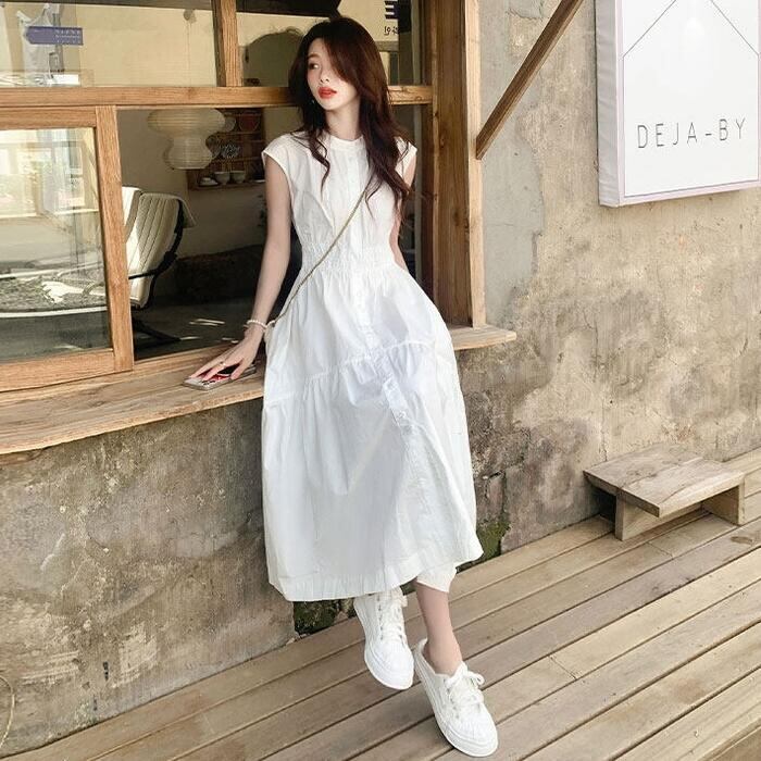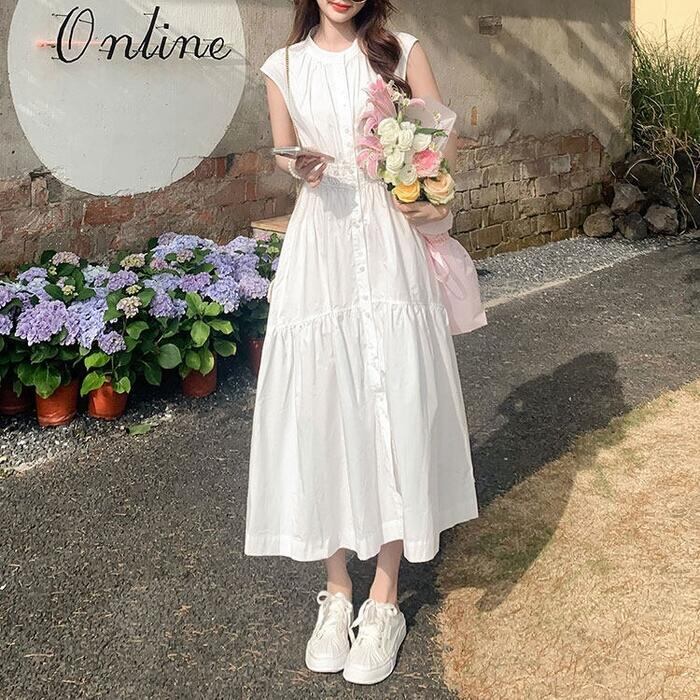 大きいサイズ エレガント フェミニン おしゃれ シンプル ワンピース ドレス レディース きれいめ カジュアル 大人可愛い 春 秋 夏 半袖 フレンチスリーブ ミモレ丈 ティアード ハイウエスト シャーリング Aライン ホワイト 白 20代 30代 40代 50代 S M L XL