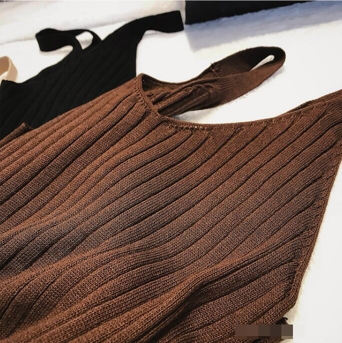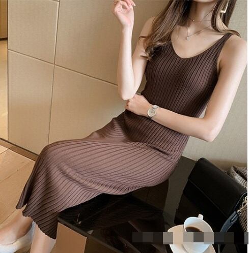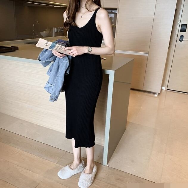 全3色 ニットワンピース ミディ丈 Vネック ゆったり 無地 涼し気 ノースリーブ