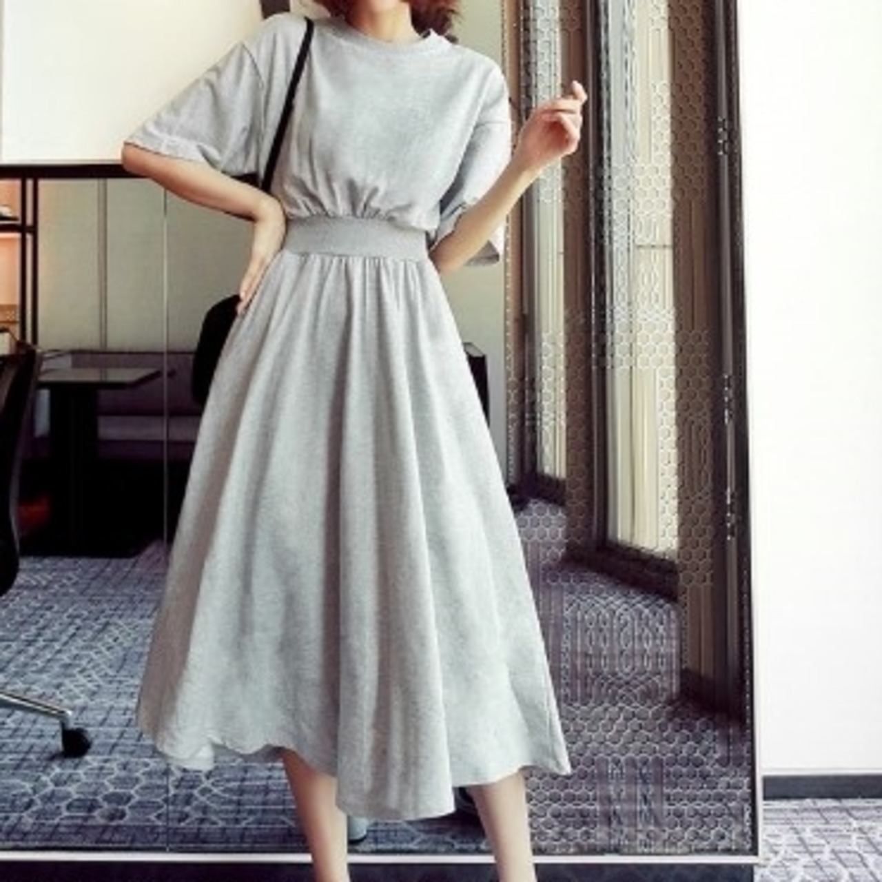 全2色 ワンピース 半袖 ラウンドネック ウエスト絞り ウェストゴム ロング丈 ひざ下丈 コットン 上品 フェミニン お呼ばれ