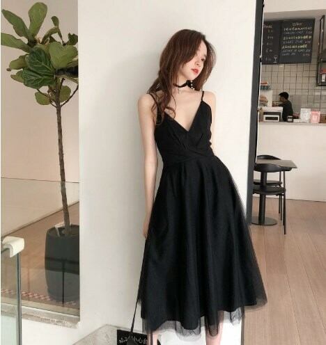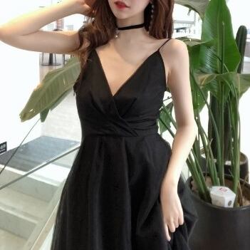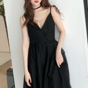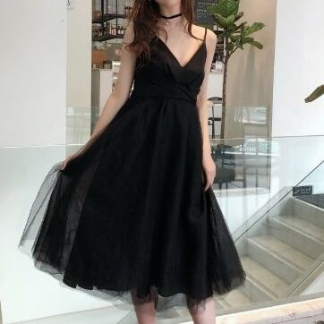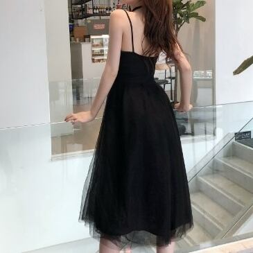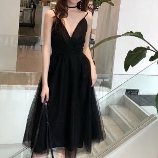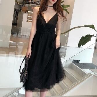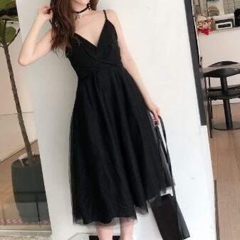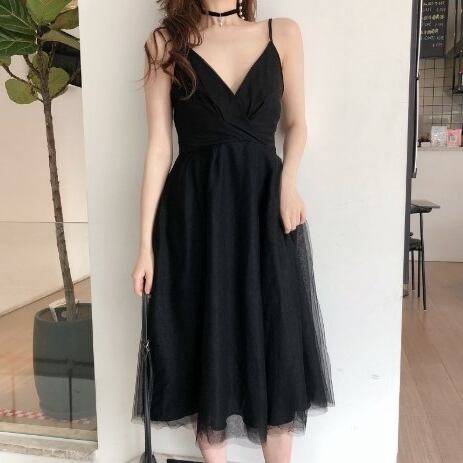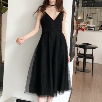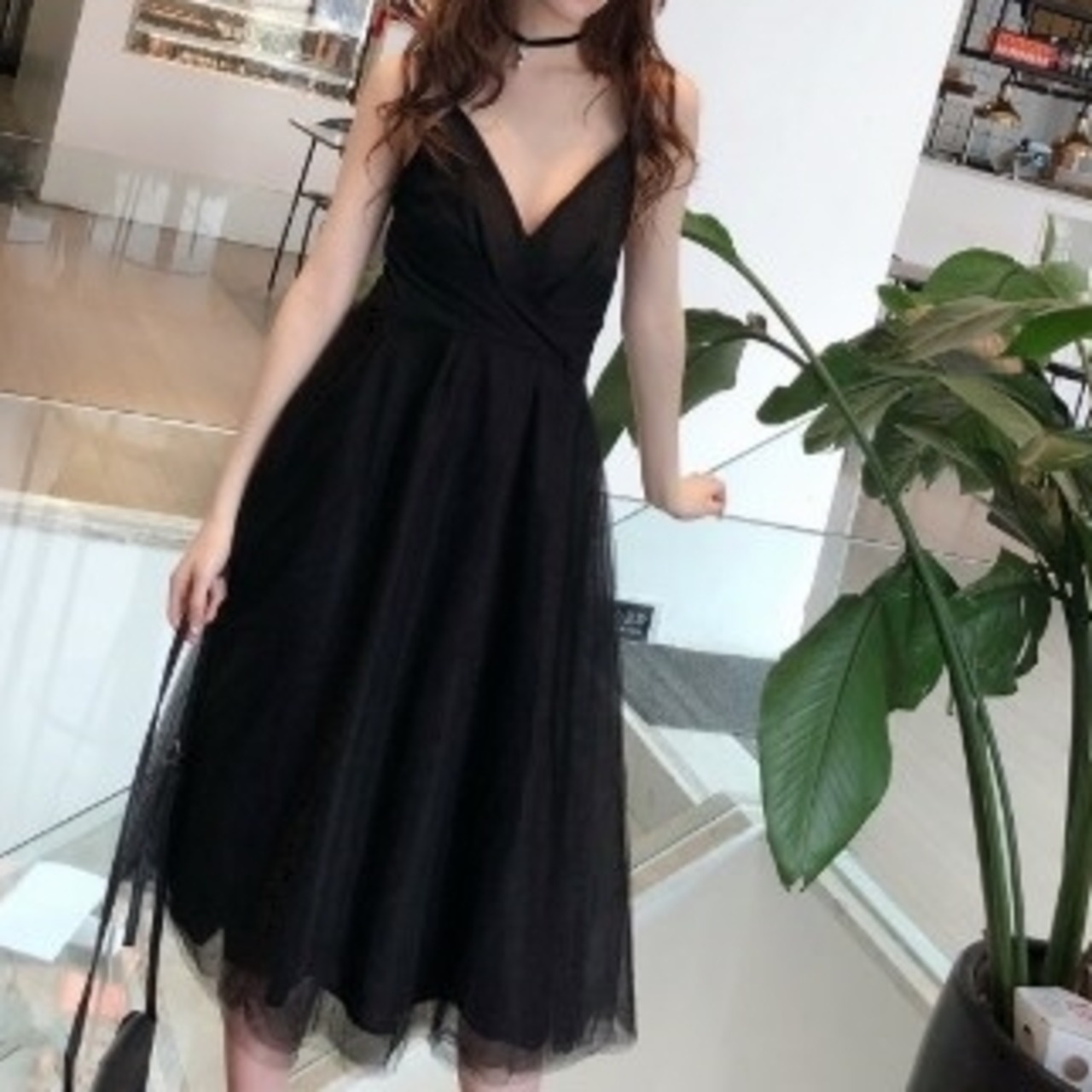 ワンピース 裾レース ノースリーブ スリング ハイウェスト ミディ丈 Vネック フェミニン