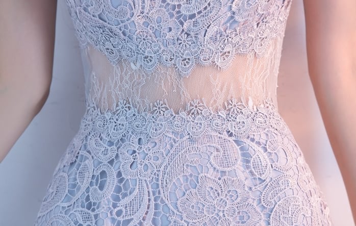 背中、首元、ウエストがシースルーになっており、エレガントでありながらモダンなデザイン。