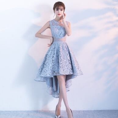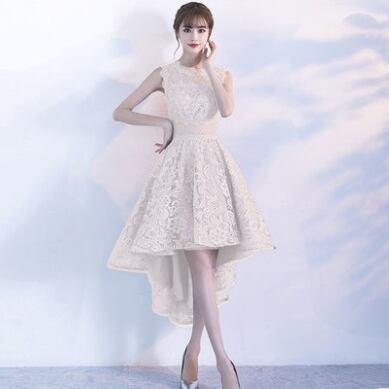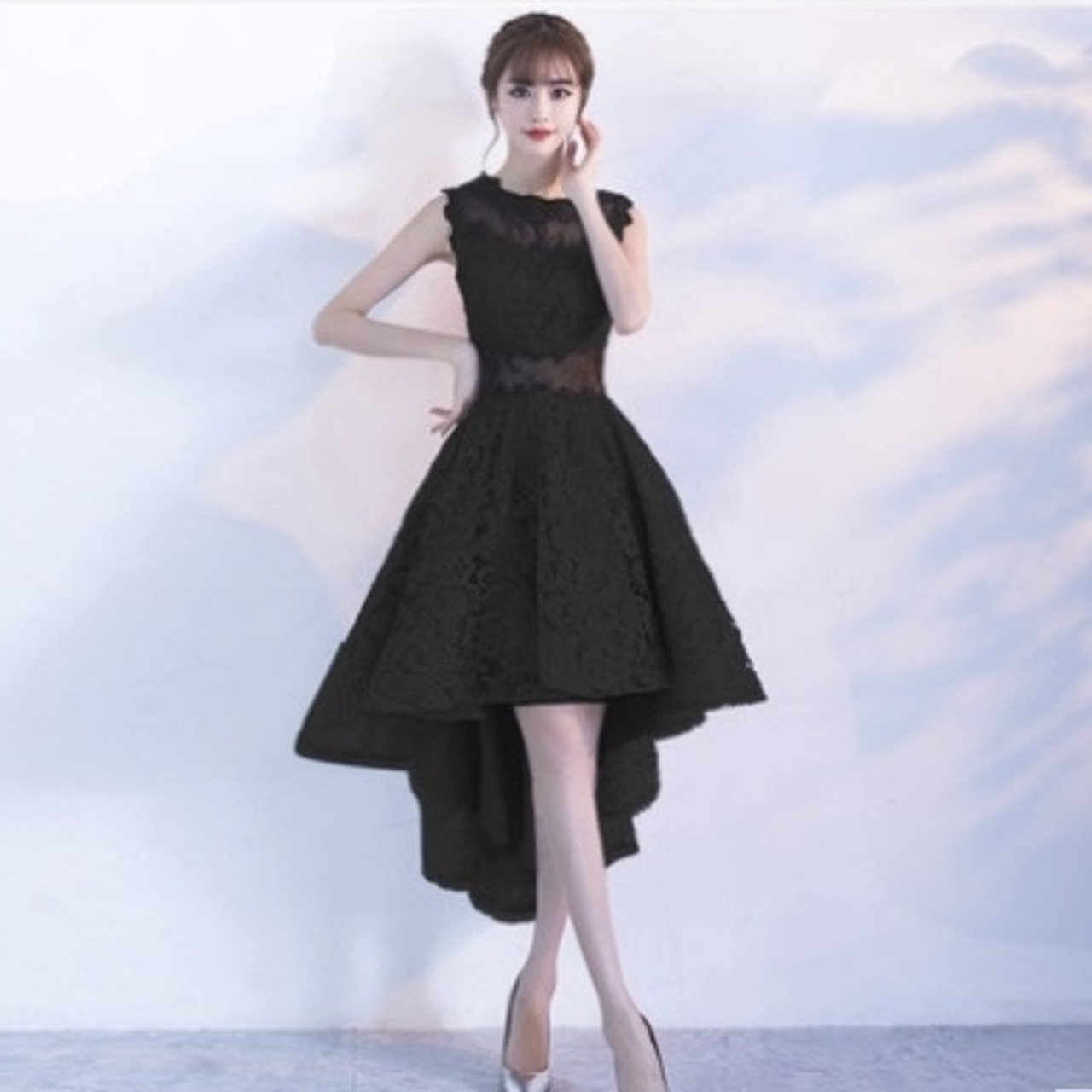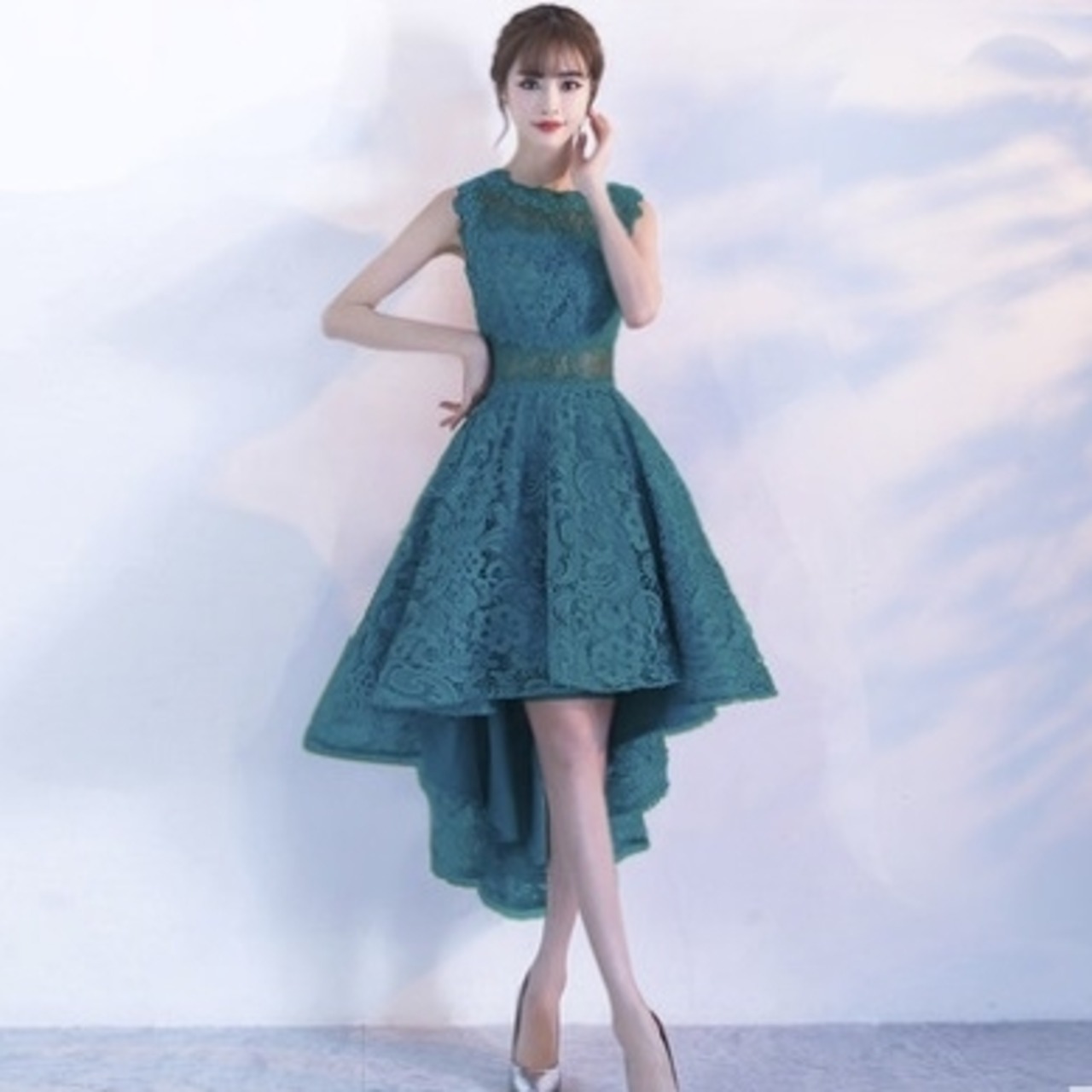 ひざ丈のドレスもありますが、こちらは前がひざ上で後ろが長めのデザインです。
