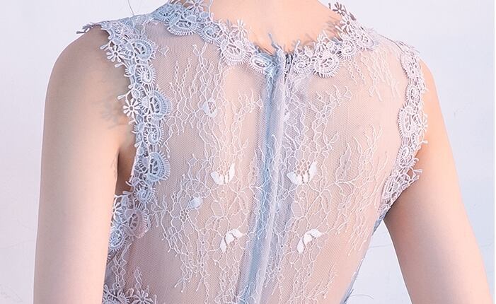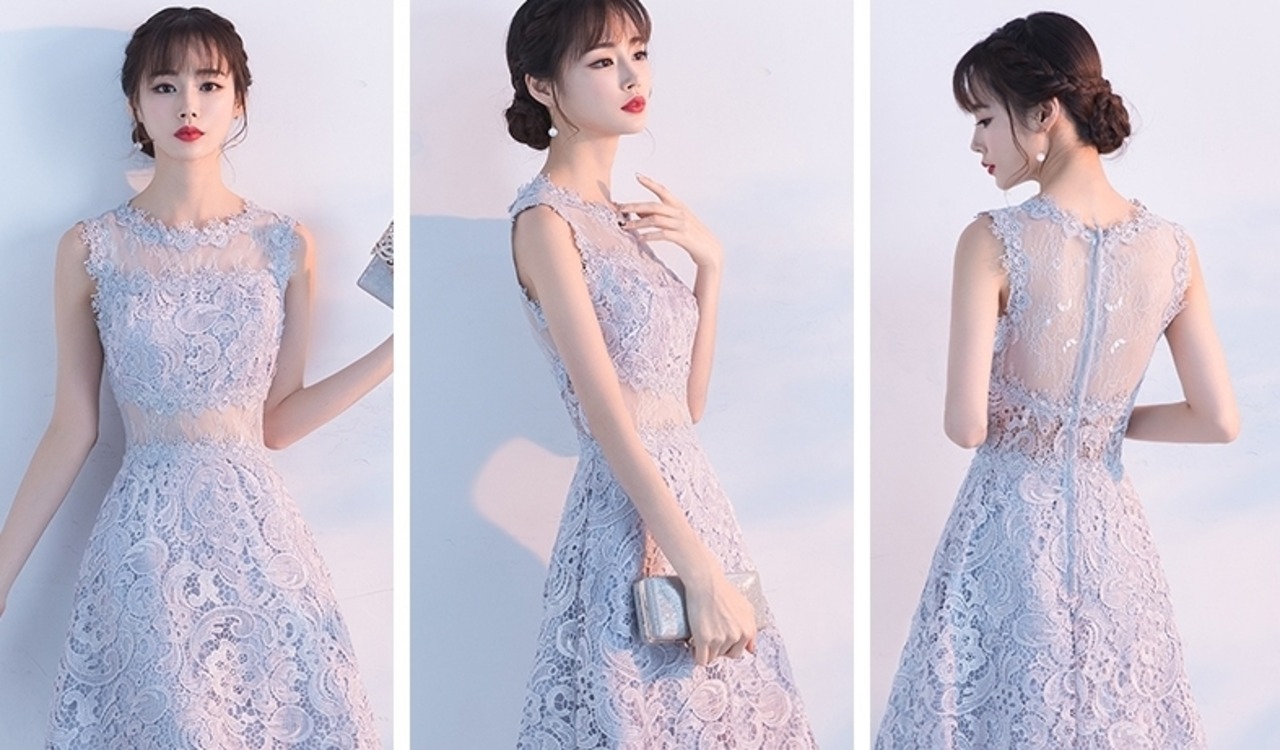 全4色 パーティードレス ワンピース ひざ丈 バックラウンドスカート シースルー 上品 ノースリーブ エレガント レース 花柄 ラウンドネック お呼ばれ