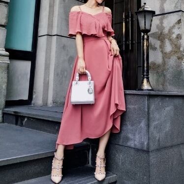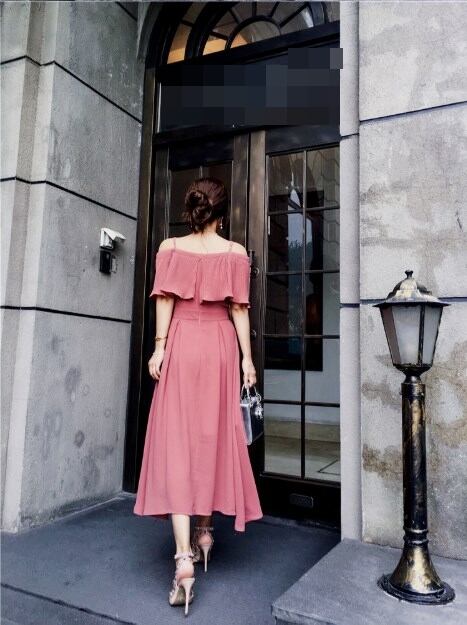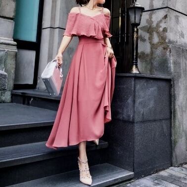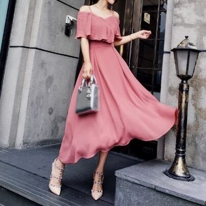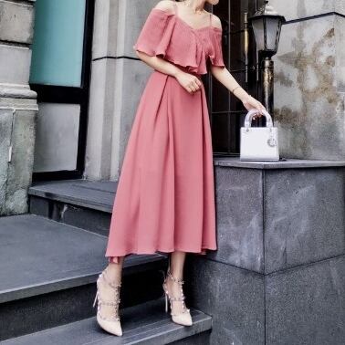 ワンピース オフショルダ フレア ロング丈 シフォン 無地 フリル フェミニン バックシャン 上品 お呼ばれ
