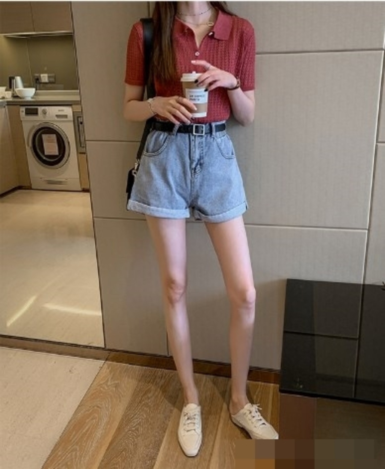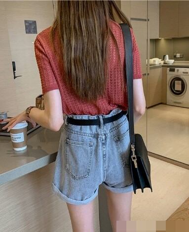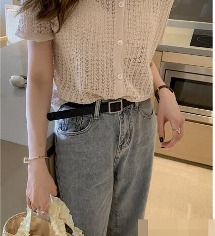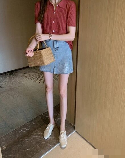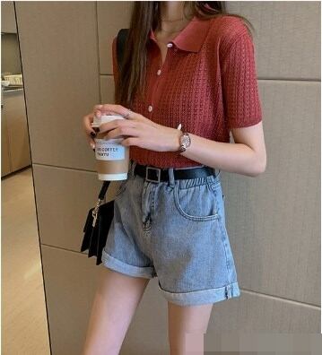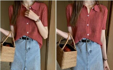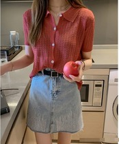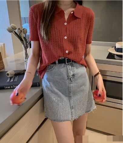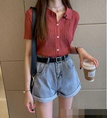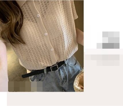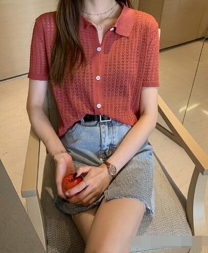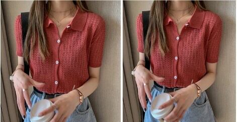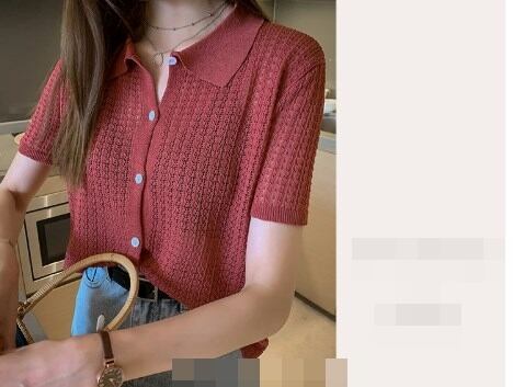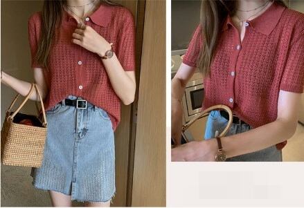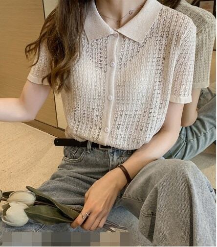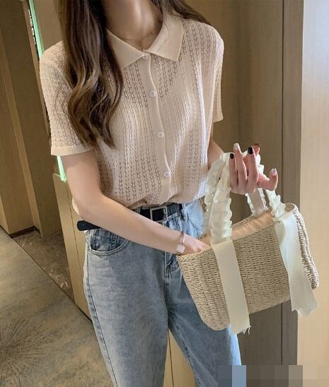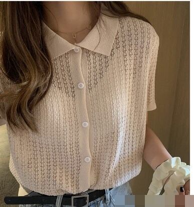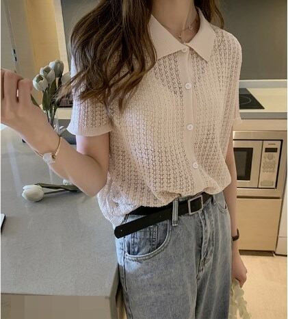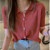 全2色 ニット シャツ フロントボタン 半袖 オープンカラー 無地 幾何学模様 カジュアル かわいい
