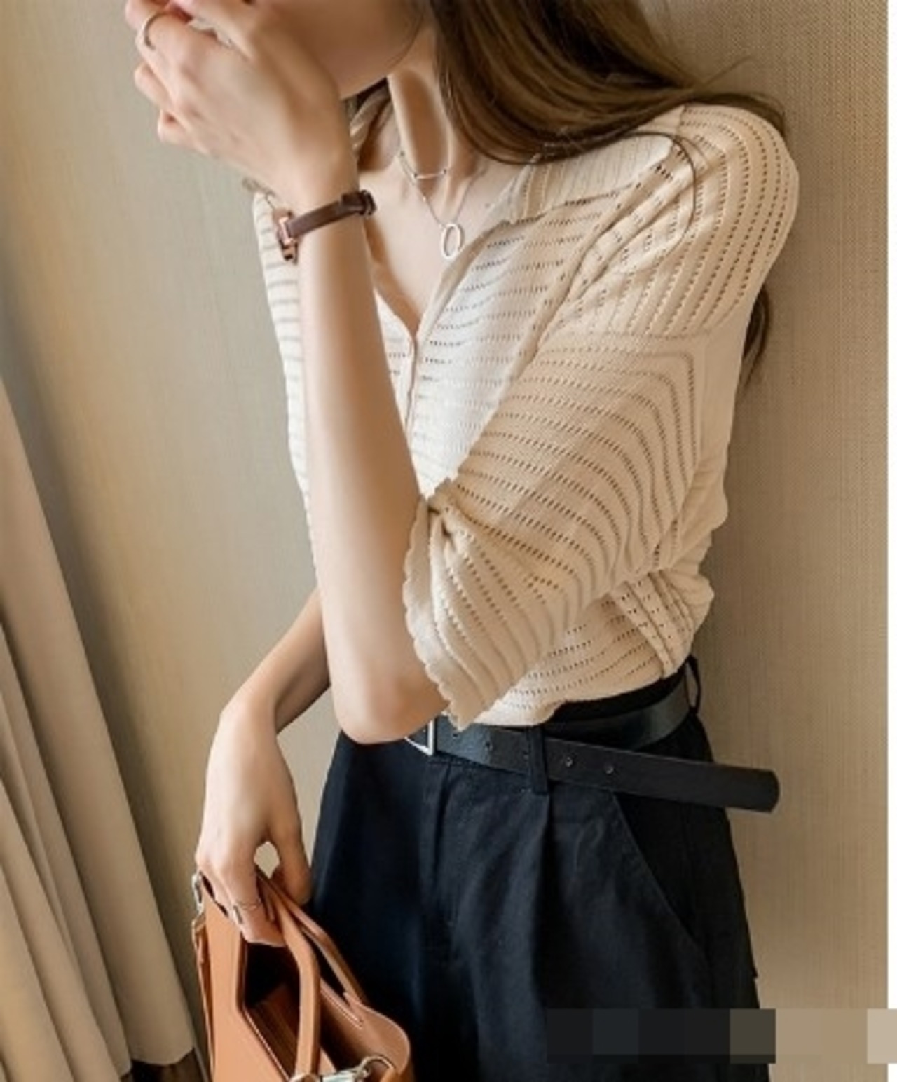 全3色 ニット シャツ Vネック 襟あり 半袖 ゆったり 無地 カジュアル かわいい きれいめ
