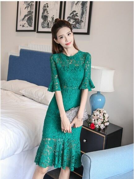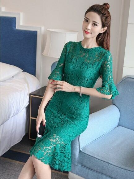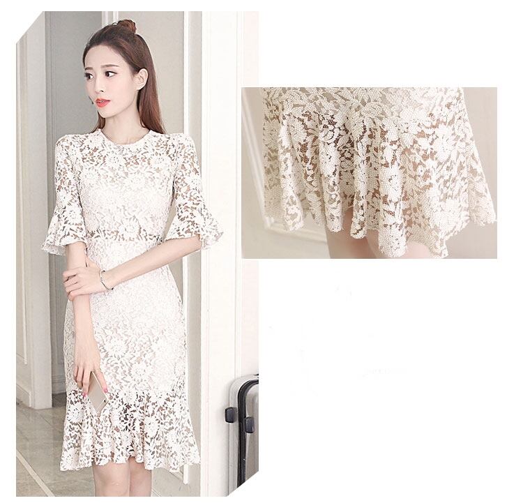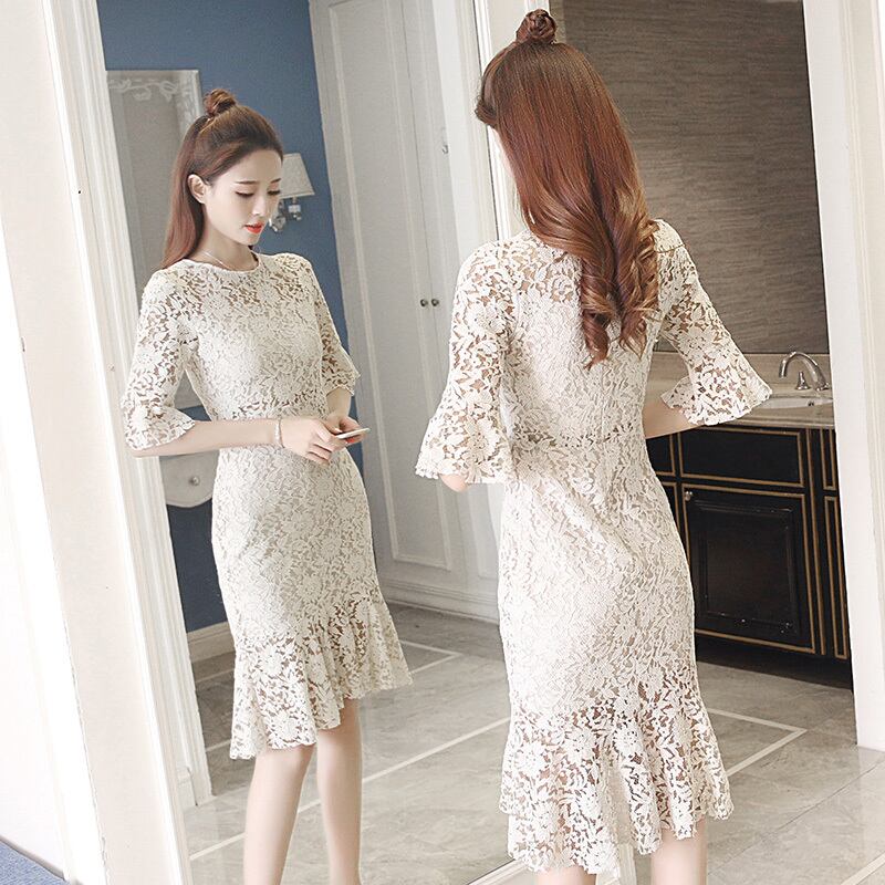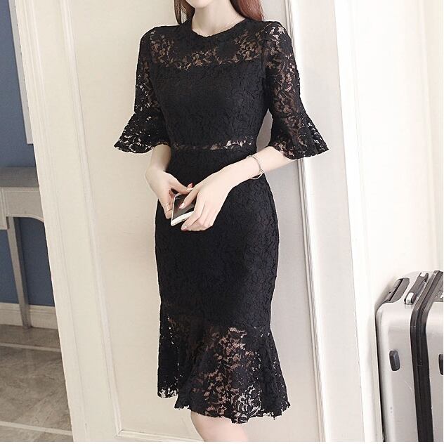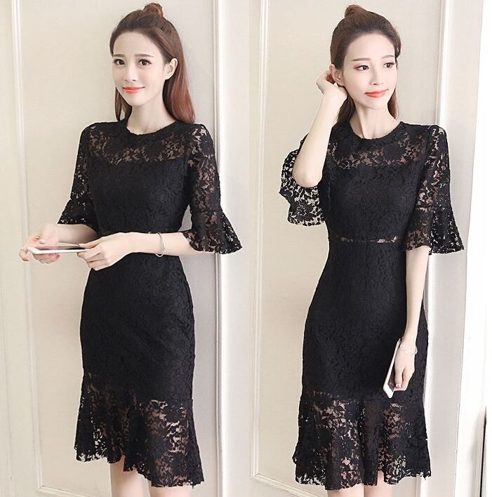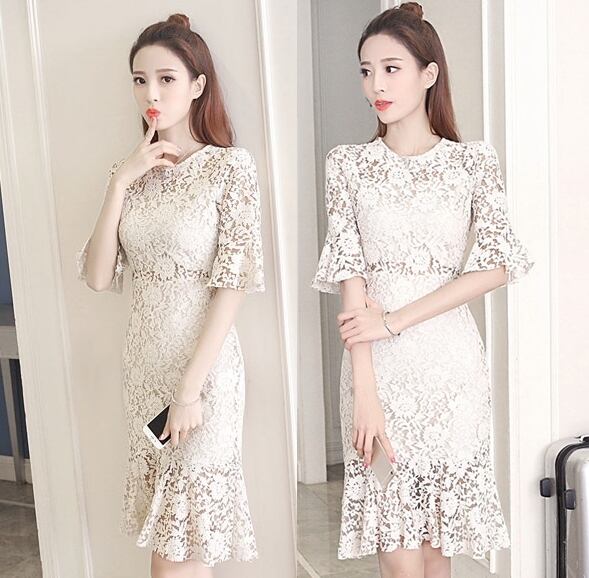 全3色 総レースワンピース 膝丈 無地 ラウンドネック 半袖 透け感 ベルスリーブ バックシャン エレガント デート イベント