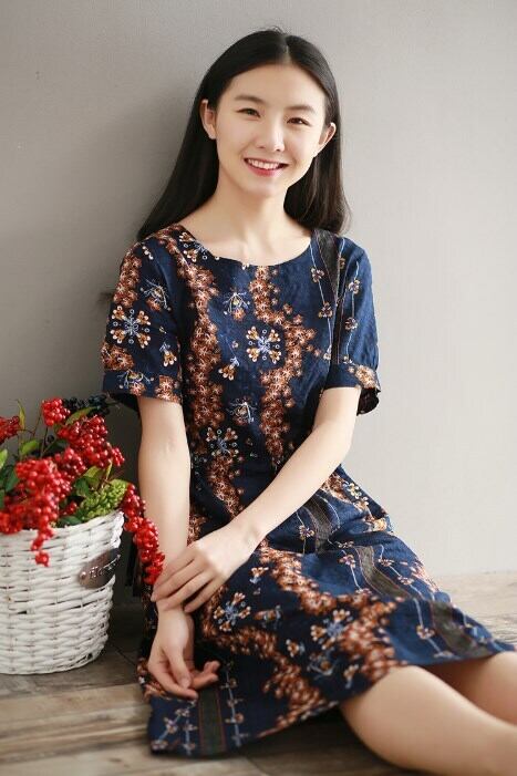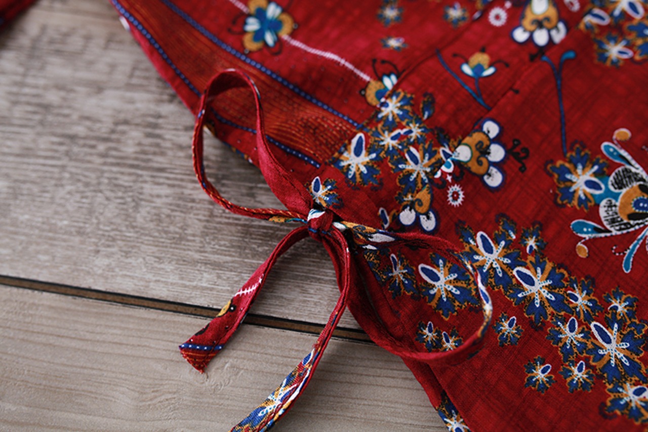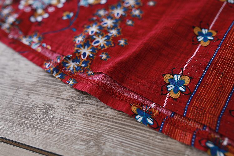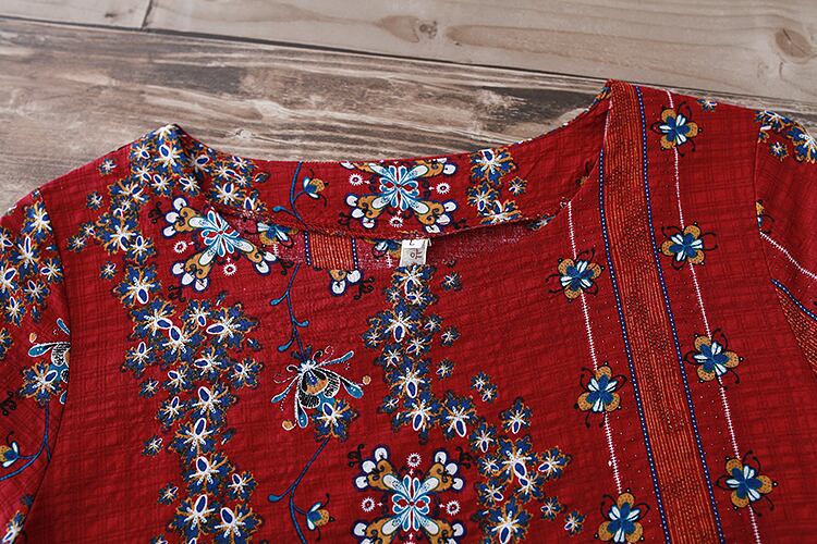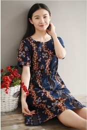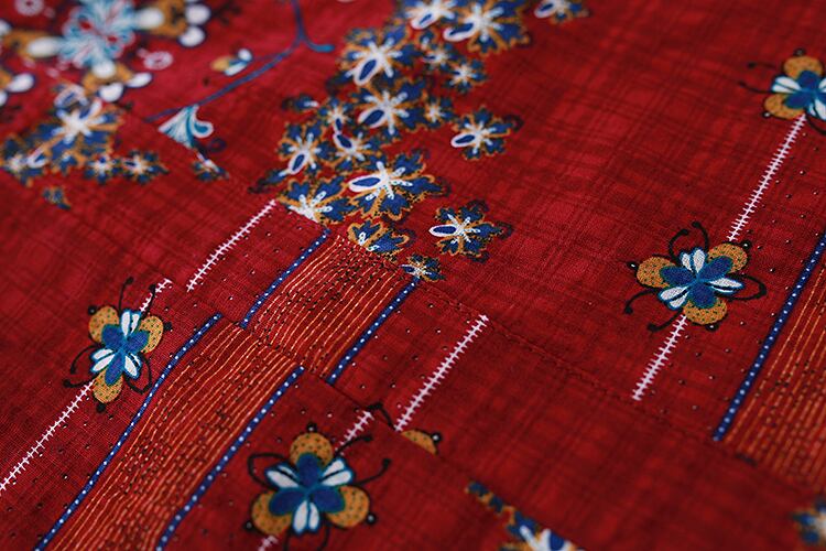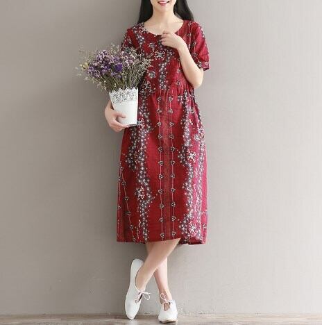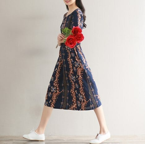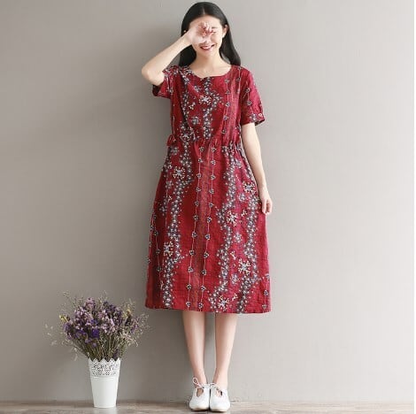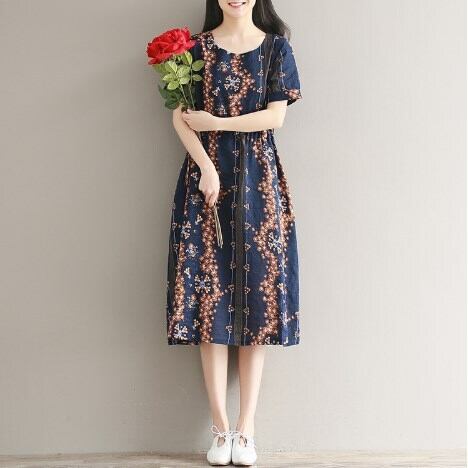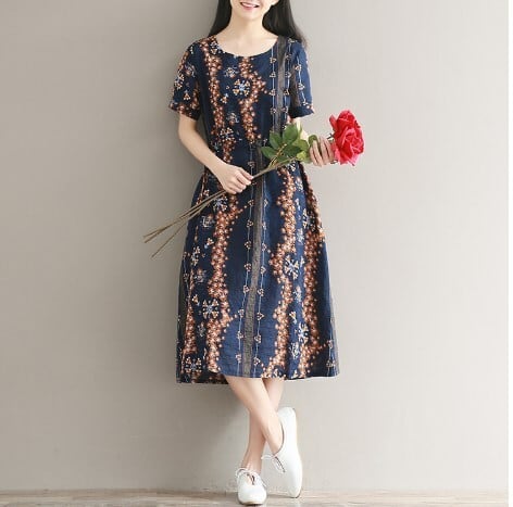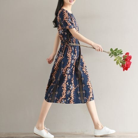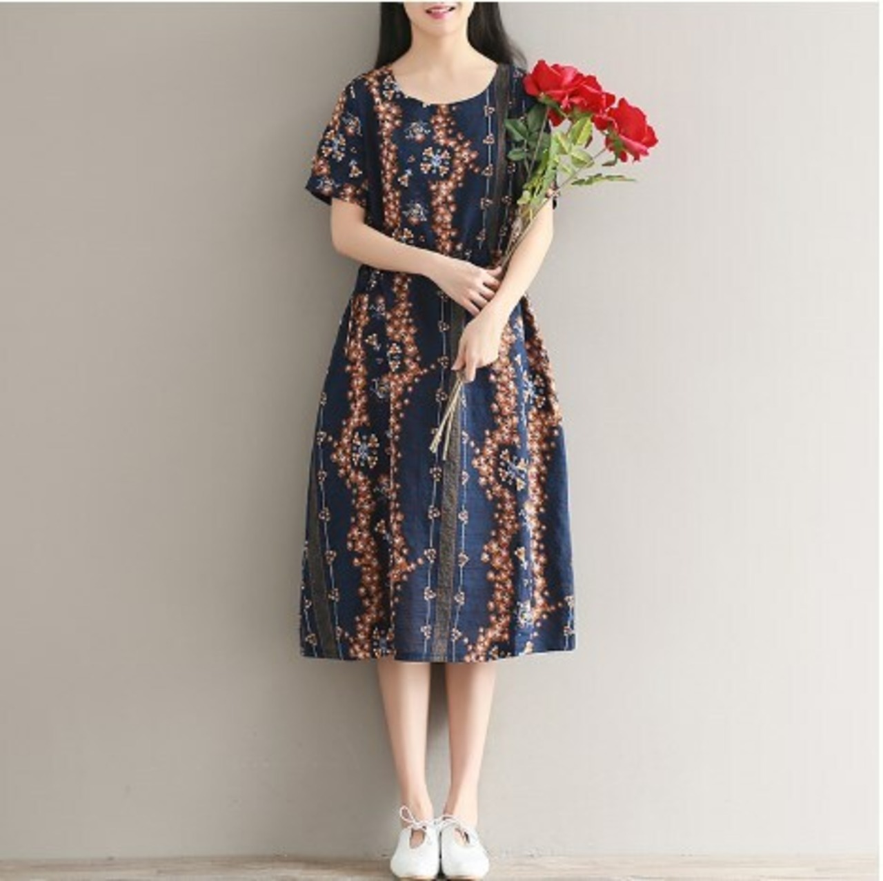 全2色 ひざ丈ワンピース 半袖 コットン レトロ 小花柄 幾何学模様 バックコンシャス 体型カバー お出かけ