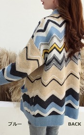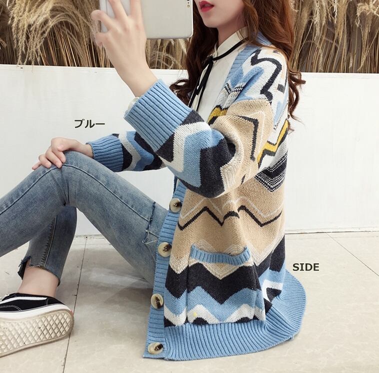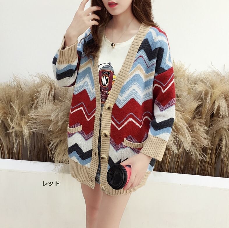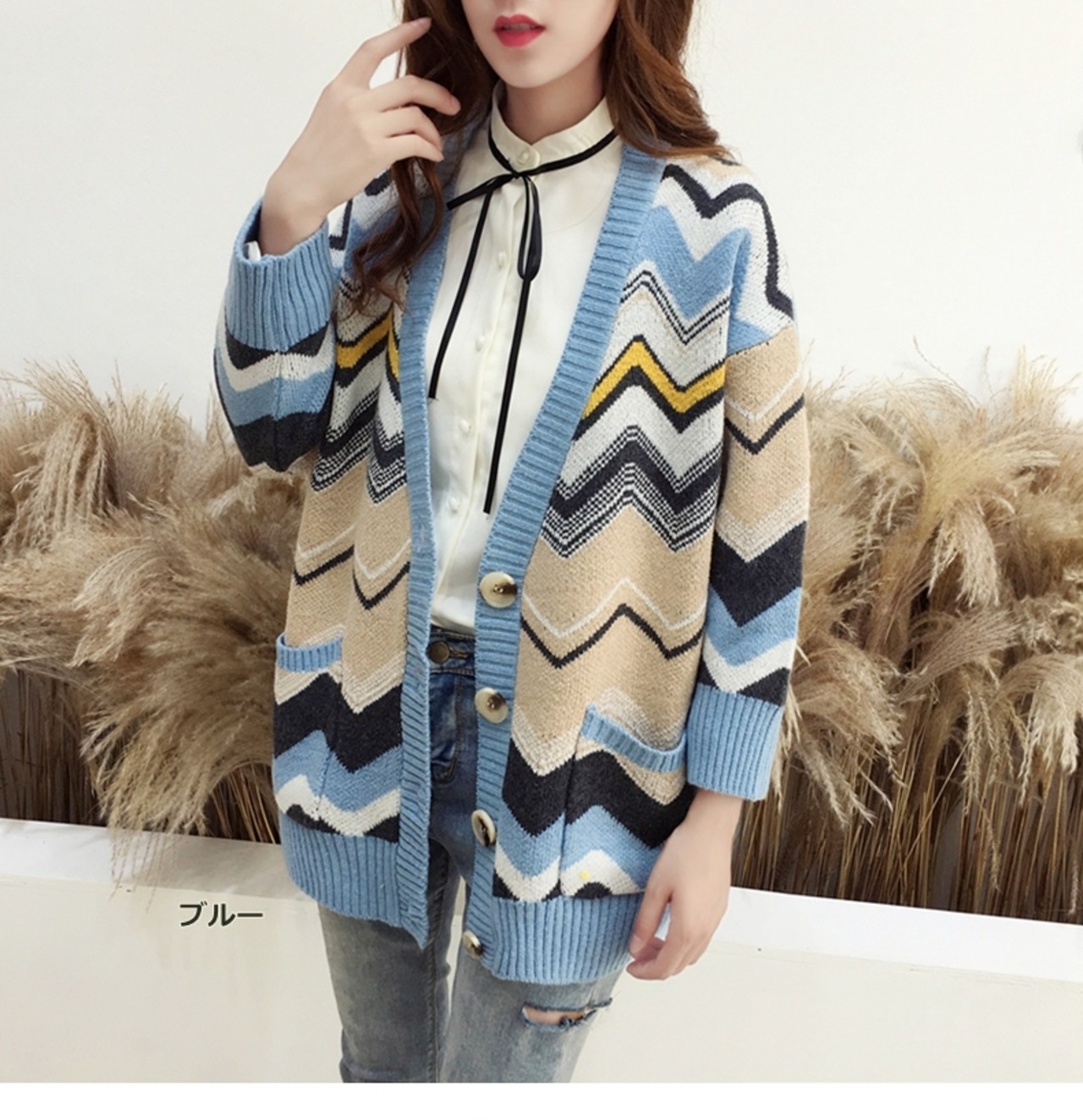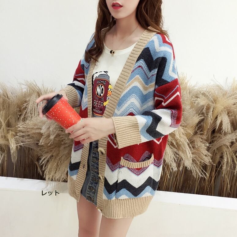 全2色 ボーダーリブニットカーディガン ストライプ カジュアル フロントボタン ゆったり 秋冬